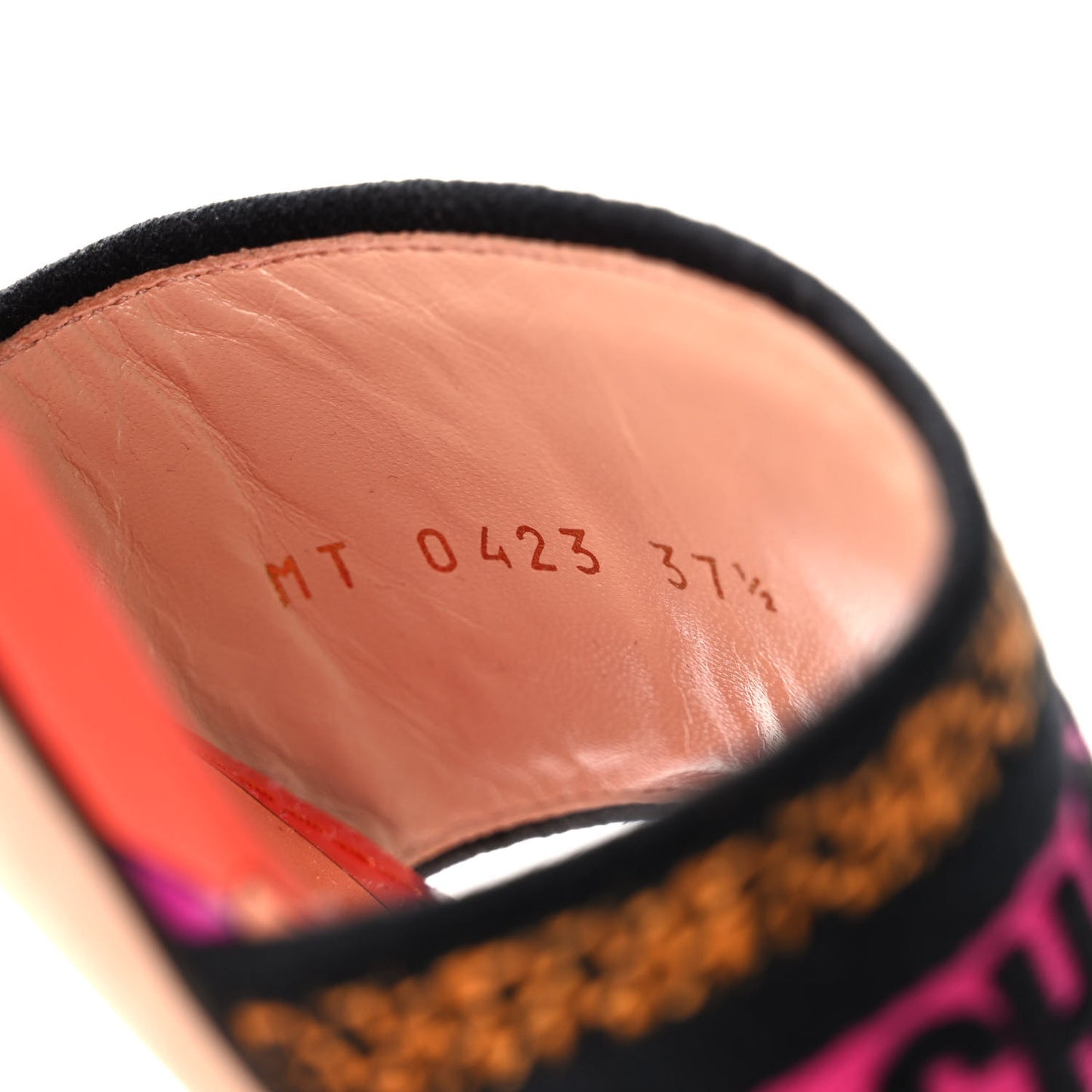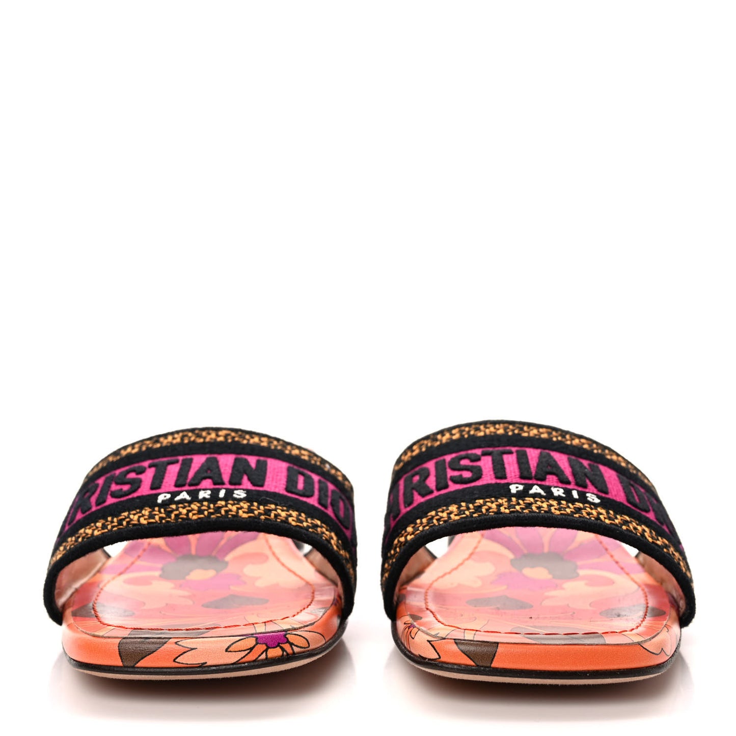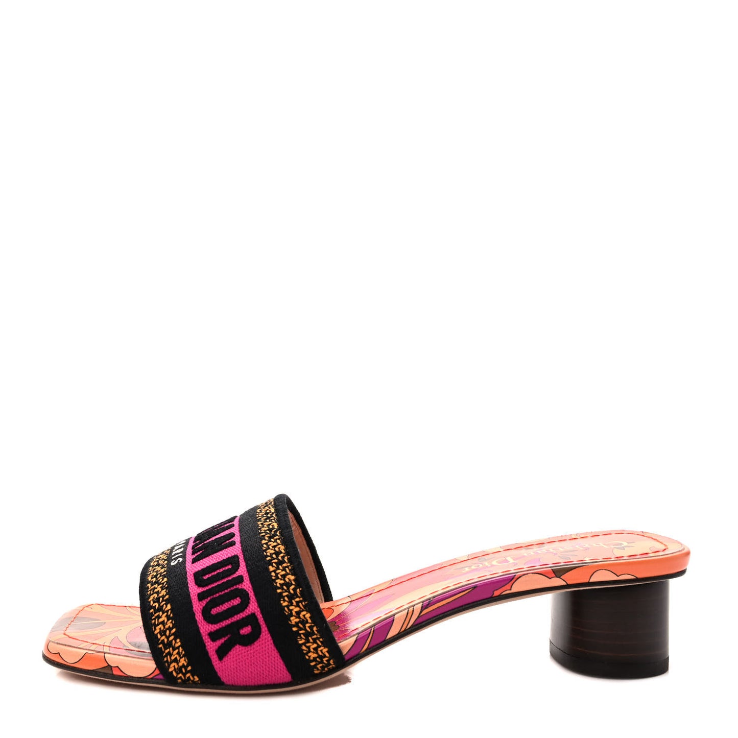 These are an authentic pair of CHRISTIAN DIOR Canvas Toile de Jouy Pop Embroidered Dway 35mm Slide Sandals size 37.5 These gorgeous sandals are crafted of embroidered cotton canvas in black and pink and feature a prominent "Christian Dior Paris" logo on the strap. They have multicolor leather insoles and orange leather outsoles with a short heel.Follow this item for alerts. Christian Dior is a registered trademark of Christian Dior. FASHIONPHILE is not affiliated with Christian Dior.