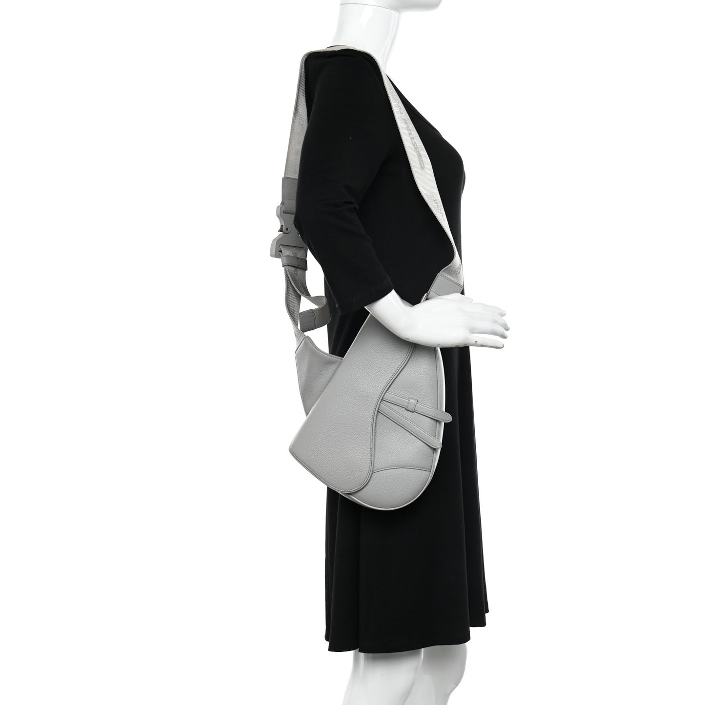 This is an authentic CHRISTIAN DIOR Grained Calfskin Kim Jones Saddle Bag in Light Grey. This stylish bag is crafted of grey grained leather and features a striped beige nylon strap with an industrial buckle clasp. The flap opens to a black fabric zippered interior.Follow this item for alerts. Christian Dior is a registered trademark of Christian Dior. FASHIONPHILE is not affiliated with Christian Dior.