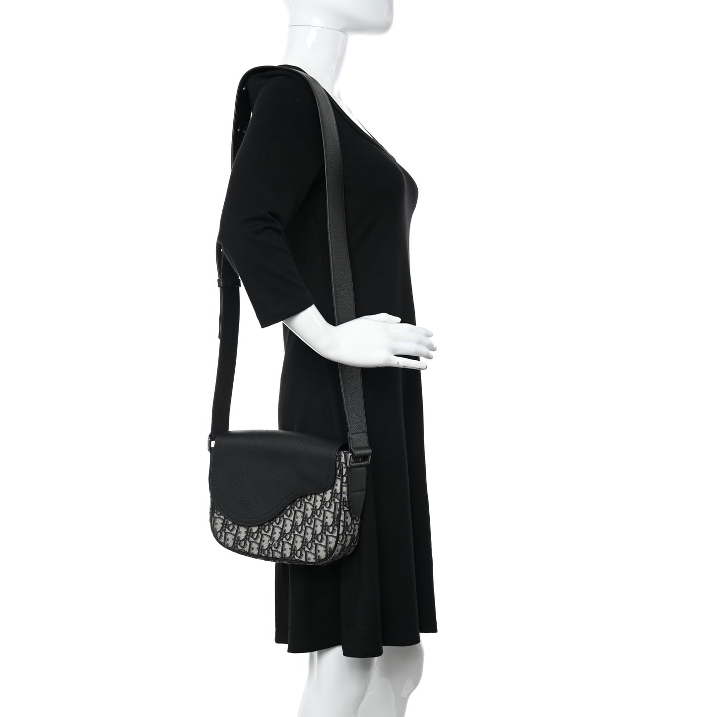 This is an authentic CHRISTIAN DIOR Grained Calfskin Oblique Saddle Messenger in Black. This is a distinctive Dior messenger bag is crafted of black and blue monogram canvas on a beige background. This shoulder bag features a saddle-shaped front pocket, an optional, adjustable black leather strap with silver hardware, and a matching handle. The front flap opens to a spacious black fabric interior with a patch pocket.Follow this item for alerts. Christian Dior is a registered trademark of Christian Dior. FASHIONPHILE is not affiliated with Christian Dior.
