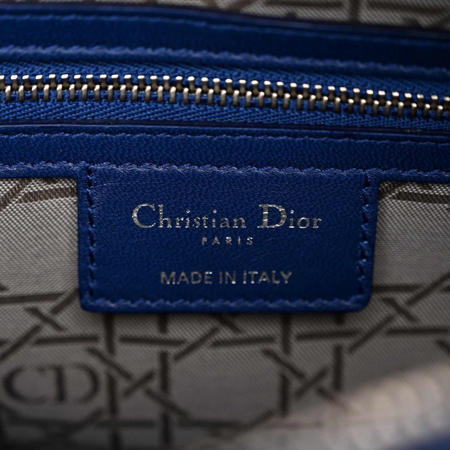 This is an authentic CHRISTIAN DIOR Lambskin Cannage Large Lady Dior in Blue. This chic tote is crafted of calfskin leather with a signature geometric embroidered quilt in a vibrant blue. The bag features leather top handles, optional shoulder strap, and polished silver hardware including Dior lettering charms. The top zipper opens to a grey Dior logo jacquard interior with a zipper pocket.