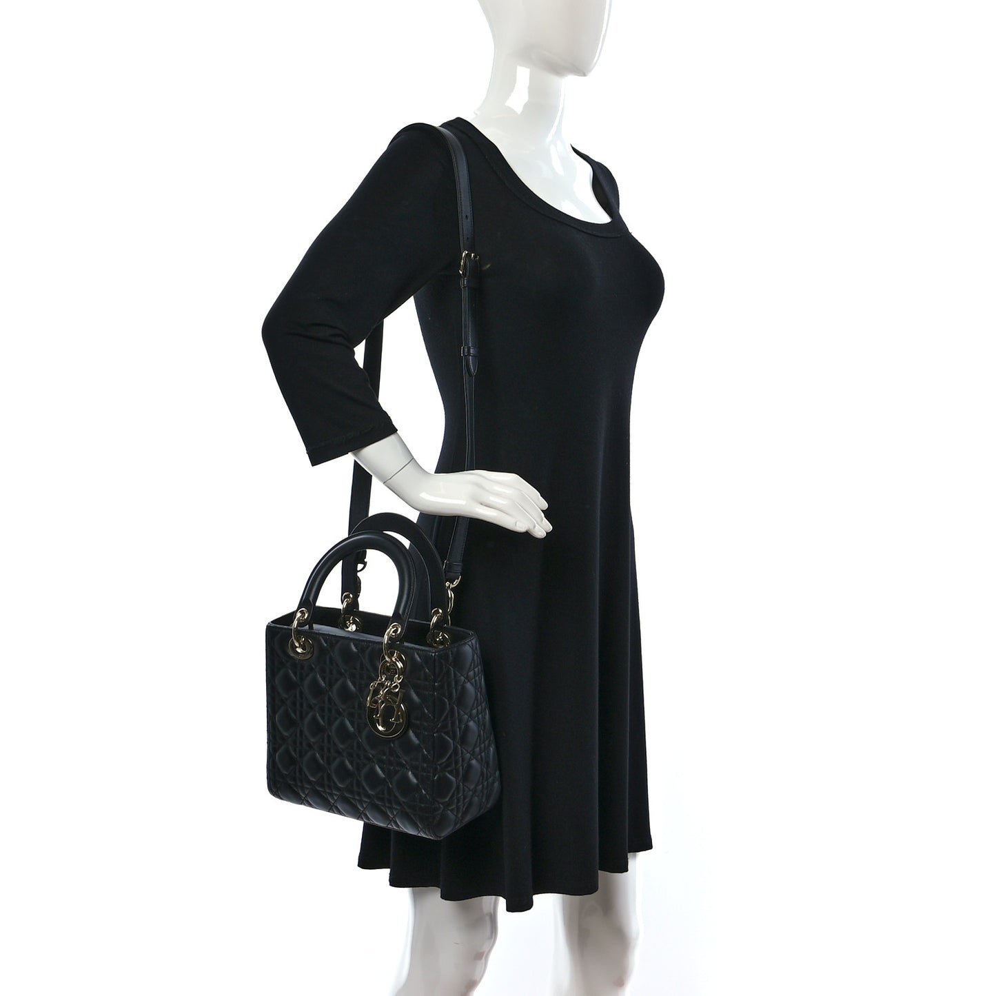 This is an authentic CHRISTIAN DIOR Lambskin Cannage Medium Lady Dior in Black. This chic tote is crafted of black cannage quilted lambskin leather. The shoulder bag features black leather top handles and an optional adjustable shoulder strap with polished gold hardware, including a hanging Dior logo charm. The top flap opens to a black fabric interior with a zipper and patch pocket.Follow this item for alerts. Christian Dior is a registered trademark of Christian Dior. FASHIONPHILE is not affiliated with Christian Dior.