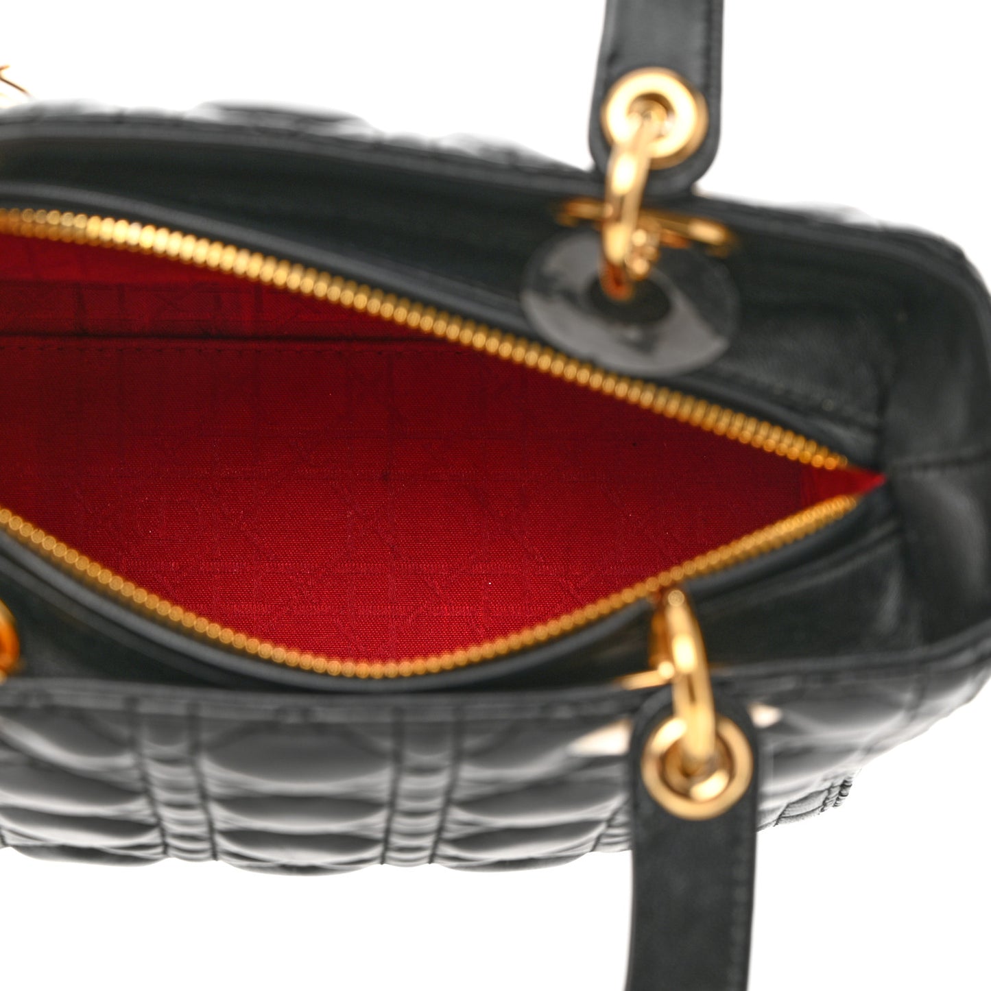 This is an authentic CHRISTIAN DIOR Lambskin Cannage Medium Lady Dior in Black. This chic tote is crafted of black cannage quilted lambskin leather. The shoulder bag features leather top handles and an optional shoulder strap with polished gold hardware, including a hanging Dior logo charm. The top zipper opens to a red Dior monogram jacquard fabric interior with a zipper pocket.Follow this item for alerts. Christian Dior is a registered trademark of Christian Dior. FASHIONPHILE is not affiliated with Christian Dior.
