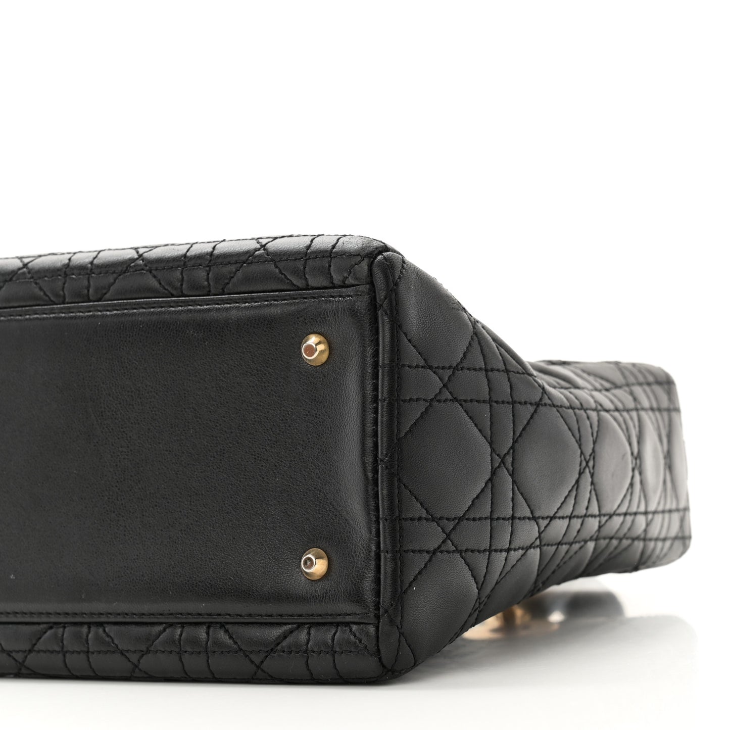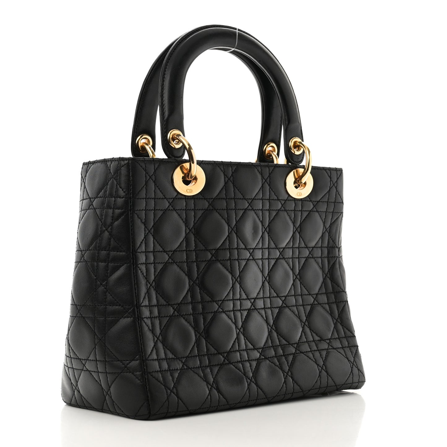 This is an authentic CHRISTIAN DIOR Lambskin Cannage Medium Lady Dior in Black. This chic tote is crafted of black cannage quilted lambskin leather. The shoulder bag features sturdy leather top handles, an optional leather shoulder strap, and polished gold hardware including a hanging Dior logo charm. The top zipper opens to a red fabric interior with a zipper pocket.Follow this item for alerts. Christian Dior is a registered trademark of Christian Dior. FASHIONPHILE is not affiliated with Christian Dior.