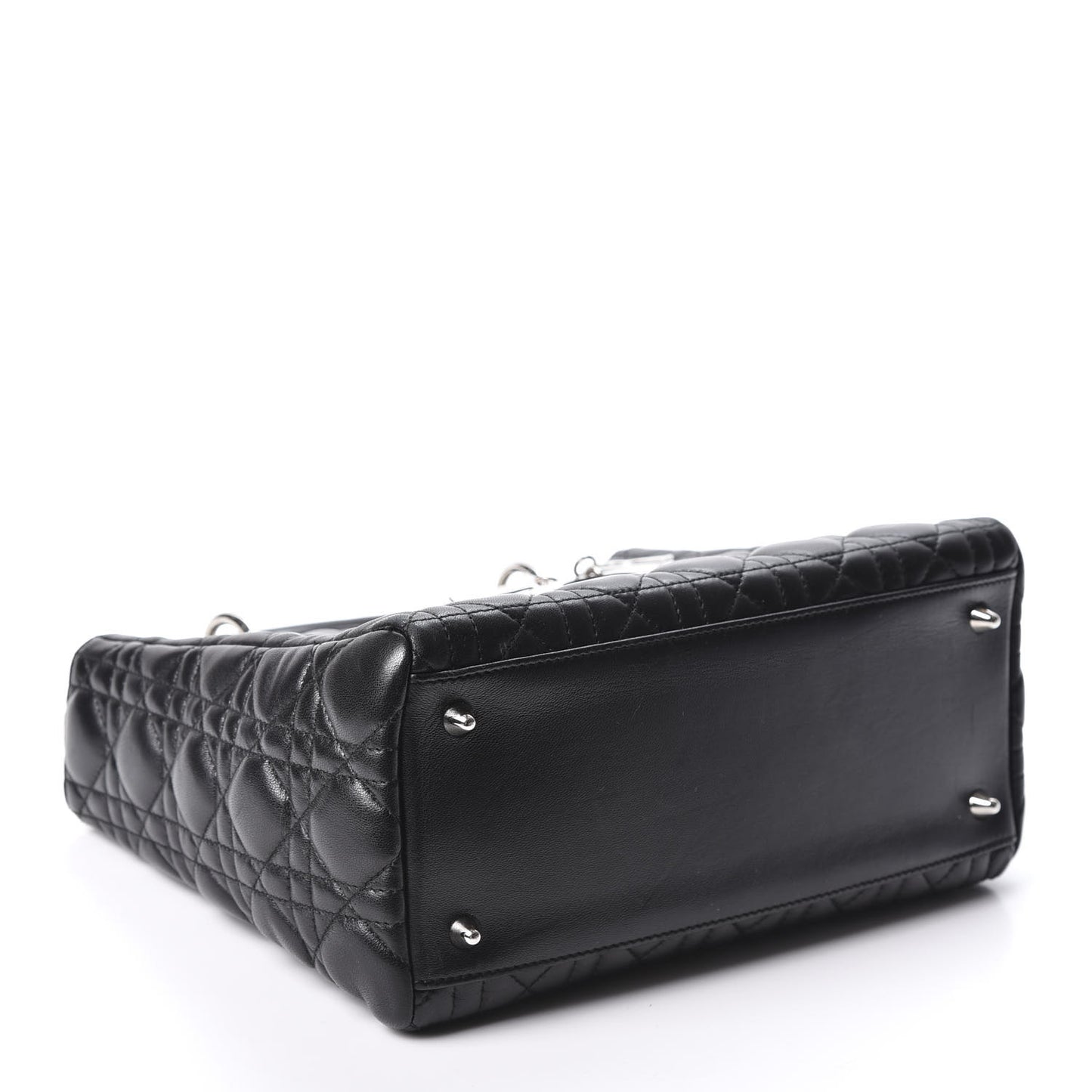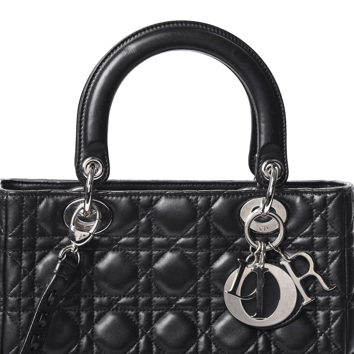 This is an authentic CHRISTIAN DIOR Lambskin Cannage Medium Lady Dior in Black. This chic tote is crafted of black cannage quilted lambskin leather. The shoulder bag features sturdy leather top handles and polished silver hardware including a hanging Dior logo charm. The top zipper opens to a black Dior monogram jacquard fabric interior with a zipper pocket. This is a stylish tote for day or evening wear, from Christian Dior! ***Please note that the strap with this bag is Christian Dior original but does not belong to the bag***Follow this item for alerts. Christian Dior is a registered trademark of Christian Dior. FASHIONPHILE is not affiliated with Christian Dior.