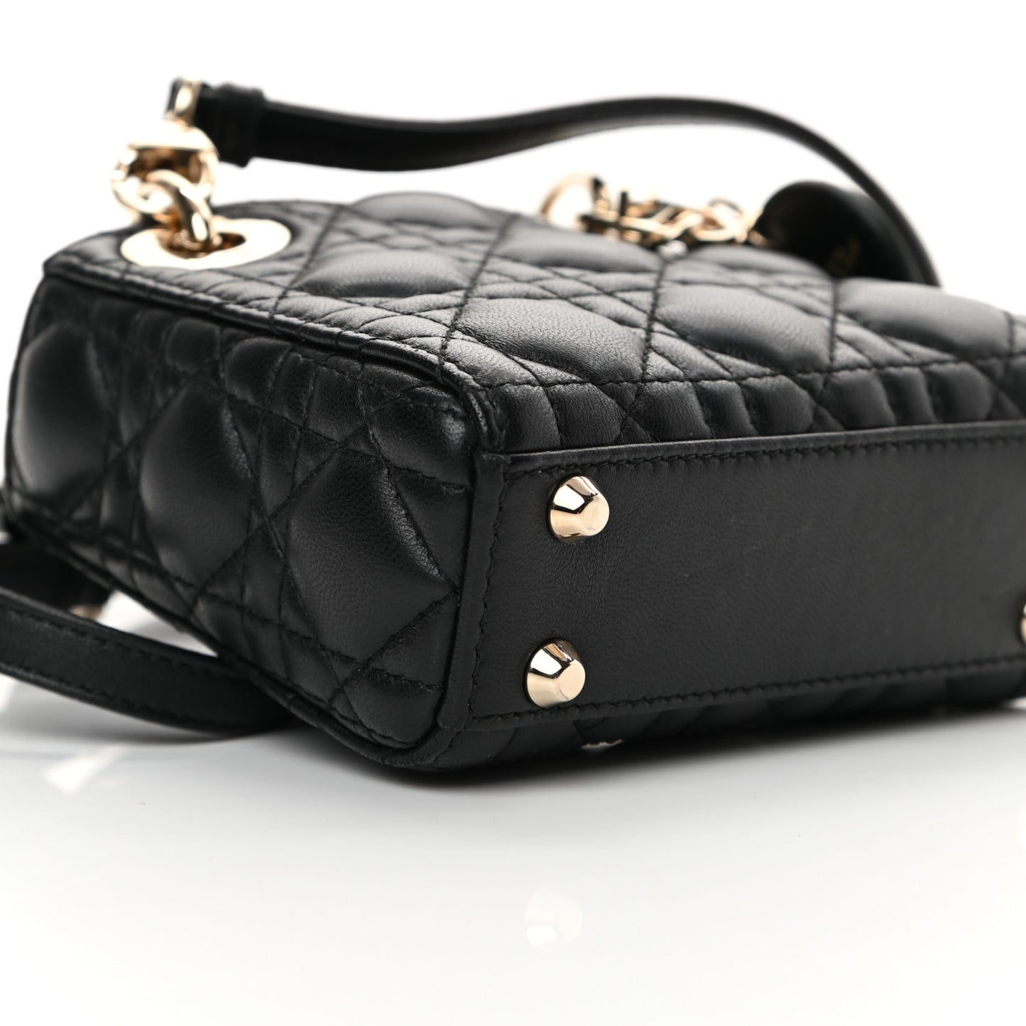 This is an authentic CHRISTIAN DIOR Lambskin Cannage Micro Lady Dior in Black. This mini tote is crafted of lambskin leather with a geometric-quilted design in black. The bag has matching black leather top handles and polished light gold hardware including a hanging Dior charm and an optional leather crossbody strap. The interior is black suede.Follow this item for alerts. Christian Dior is a registered trademark of Christian Dior. FASHIONPHILE is not affiliated with Christian Dior.