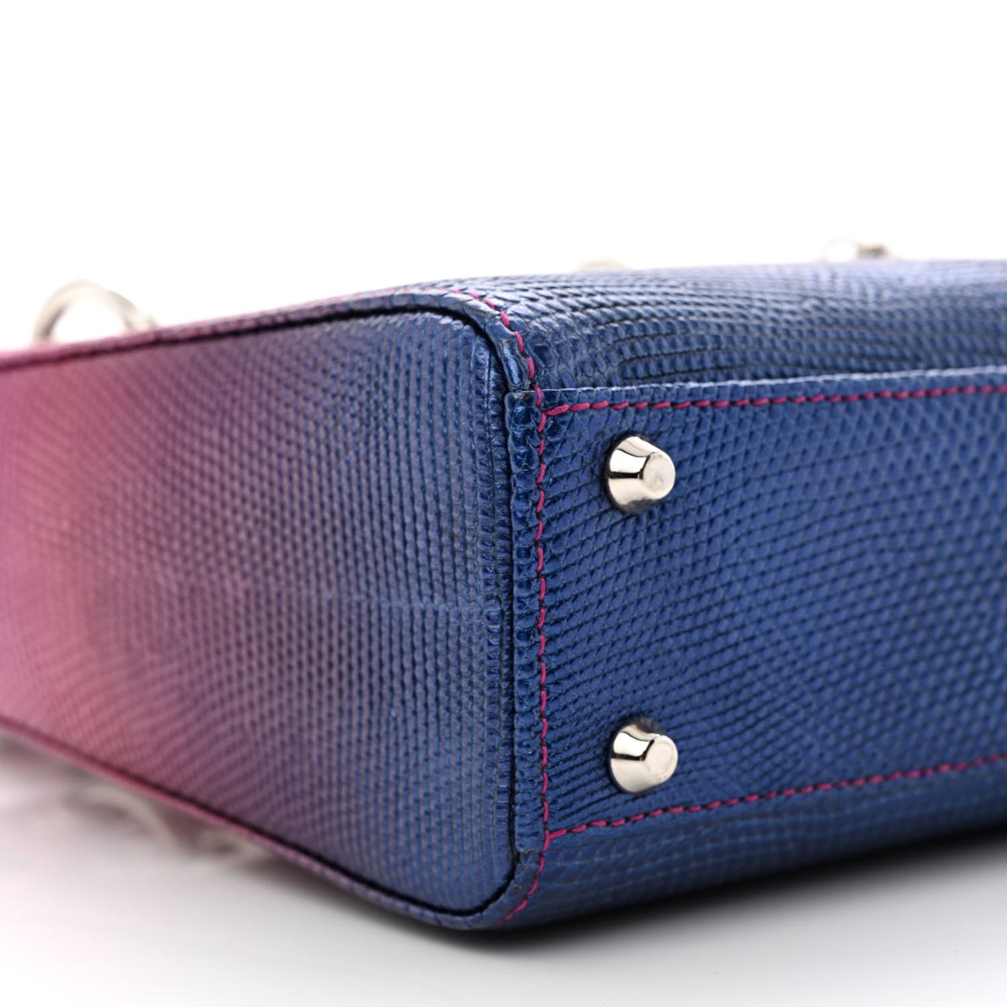 This is an authentic CHRISTIAN DIOR Lizard Gradient Mini Lady Dior. This delightful mini handbag is crafted of beautifully textured lizard in ombre pink to navy blue with matching leather top handles and optional silver chain link shoulder strap with a shoulder pad. It features polished silver hardware including handle rings, large decorative eyelets and Dior initials charm. The interior is a pink suede with a zipper pocket.Follow this item for alerts. Christian Dior is a registered trademark of Christian Dior. FASHIONPHILE is not affiliated with Christian Dior.
