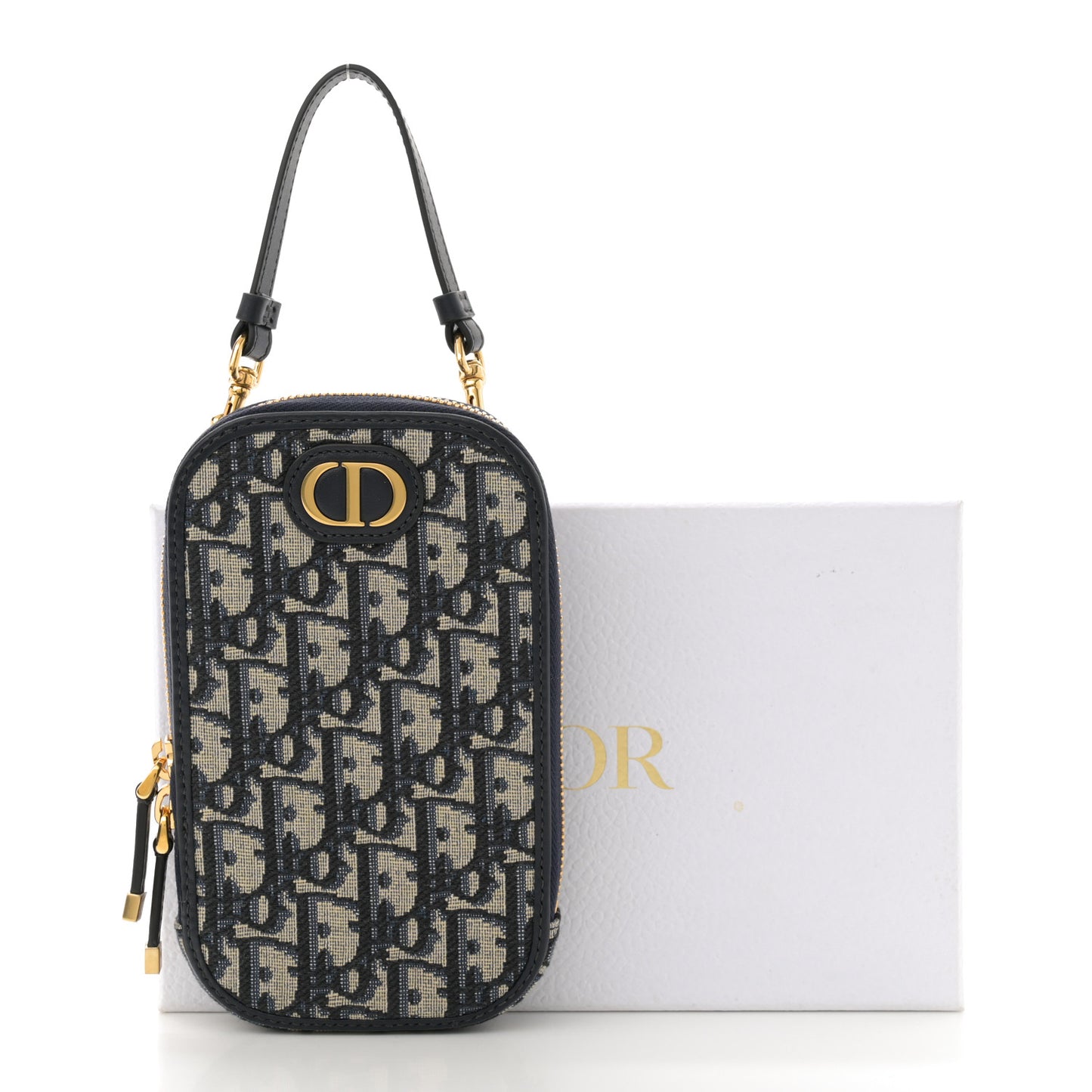 This is an authentic CHRISTIAN DIOR Oblique 30 Montaigne Phone Holder in Blue. This stunning phone holder on a chain is crafted of Dior monogram canvas in blue. The phone holder on a chain features a removable gold chain strap and a short leather strap handle. The top zipper opens to a matching blue fabric interior with leather card slots.Follow this item for alerts. Christian Dior is a registered trademark of Christian Dior. FASHIONPHILE is not affiliated with Christian Dior.