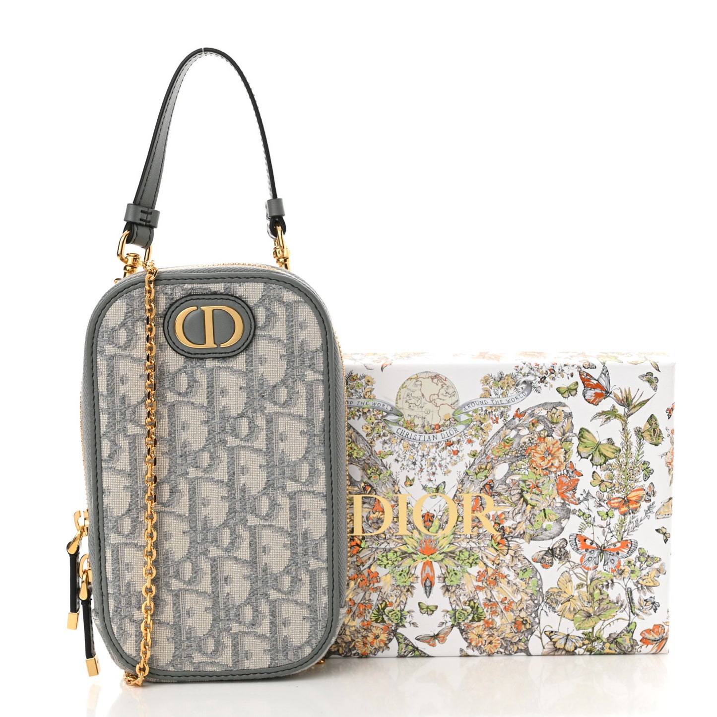 This is an authentic CHRISTIAN DIOR Oblique 30 Montaigne Phone Holder in Grey. This stunning phone holder on a chain is crafted of Dior monogram canvas in grey. The phone holder on a chain features a removable gold chain strap and a short leather strap handle. The top zipper opens to a matching matching fabric interior with leather card slots.Follow this item for alerts. Christian Dior is a registered trademark of Christian Dior. FASHIONPHILE is not affiliated with Christian Dior.