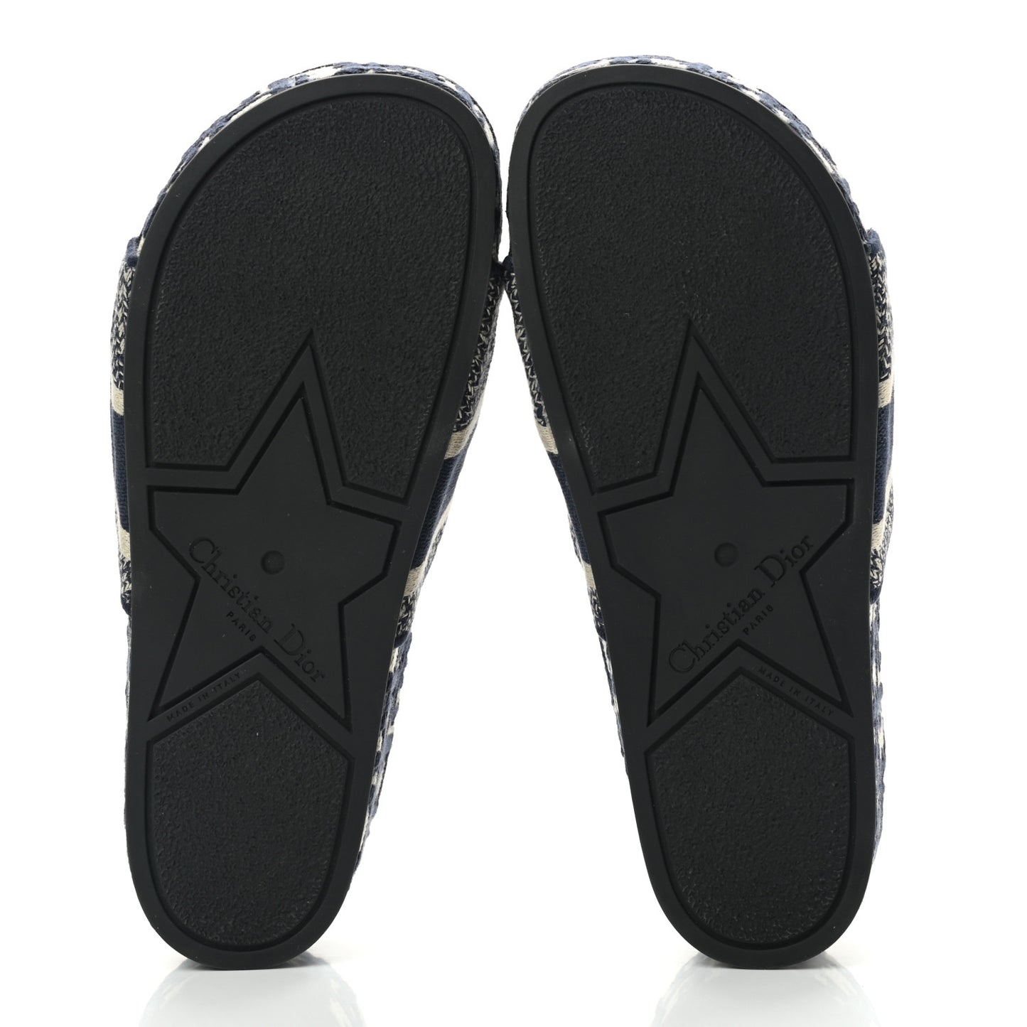 These are an authentic pair of CHRISTIAN DIOR Oblique D-Way Platform Slide Sandals size 38 in Deep Blue. These gorgeous sandals are crafted of embroidered cotton canvas in beige and blue and feature a prominent "Christian Dior Paris" Dior logo on the strap. They have navy leather insoles with a comfortable two-inch heel.Follow this item for alerts. Christian Dior is a registered trademark of Christian Dior. FASHIONPHILE is not affiliated with Christian Dior.