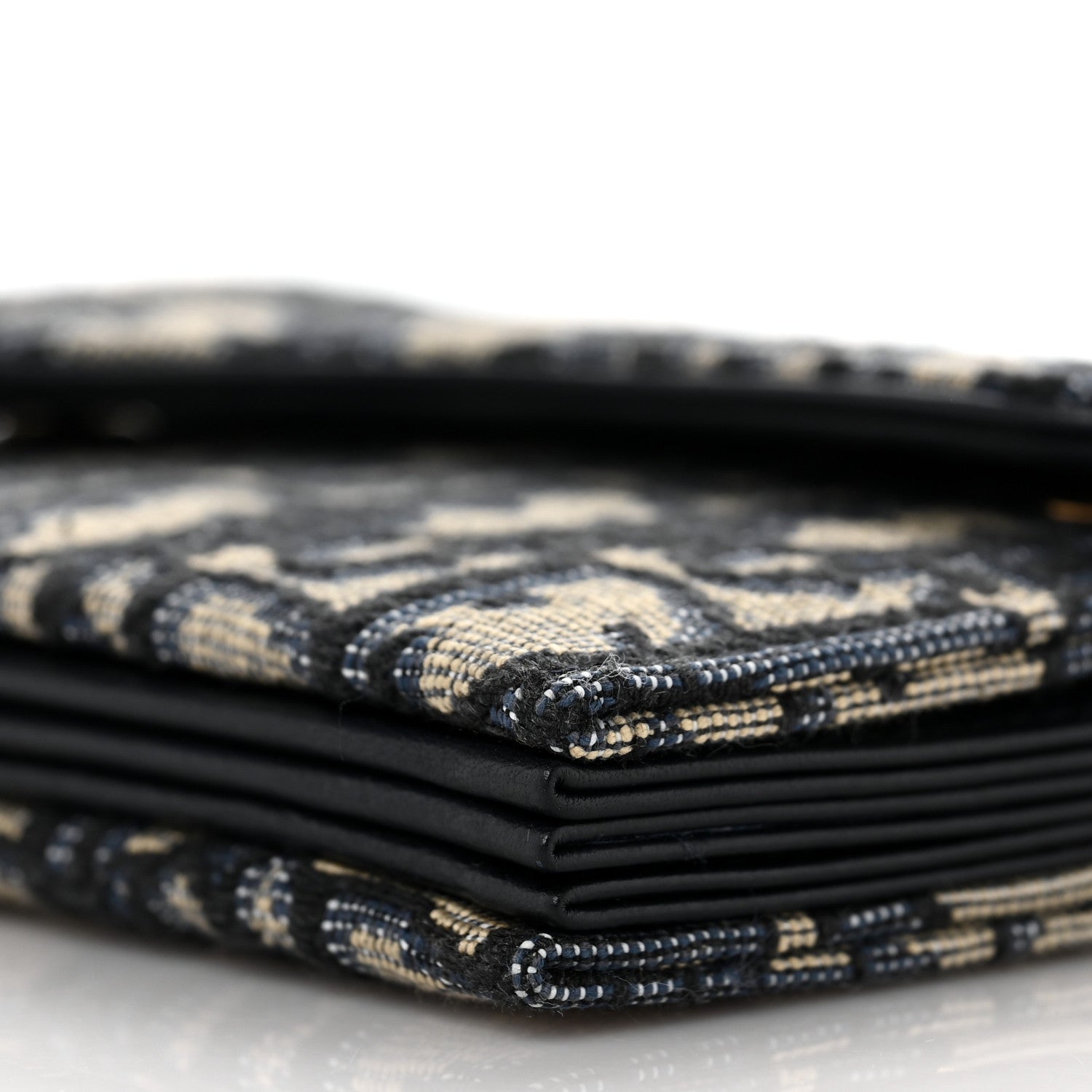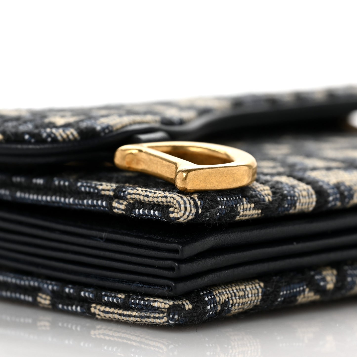 This is an authentic CCHRISTIAN DIOR Oblique Saddle Card Holder in Blue. This stylish cardholder is crafted of navy blue on beige Dior monogram canvas. The wallet features a saddle-style frontal flap with a brass Dior D charm. This opens to a partitioned navy blue leather and fabric interior.Follow this item for alerts. Christian Dior is a registered trademark of Christian Dior. FASHIONPHILE is not affiliated with Christian Dior.