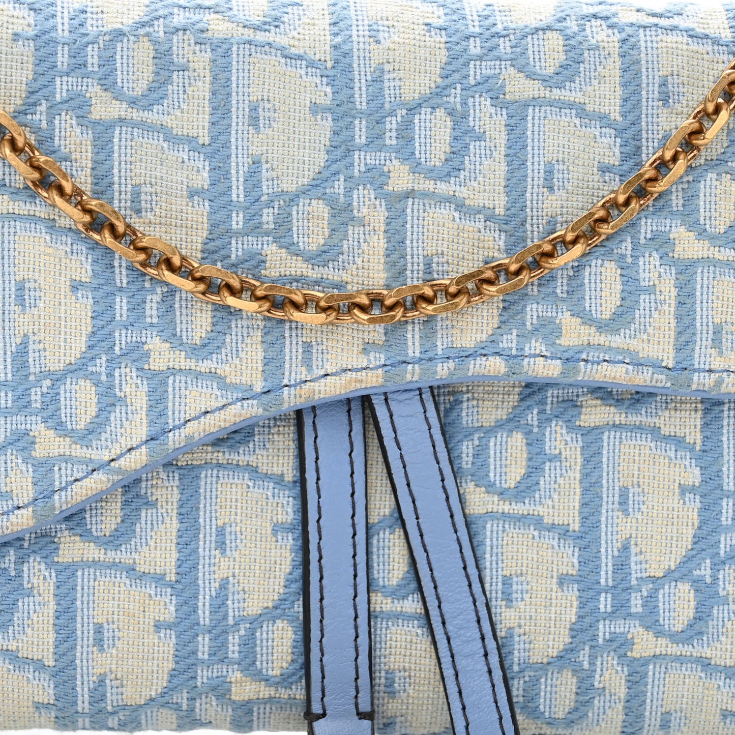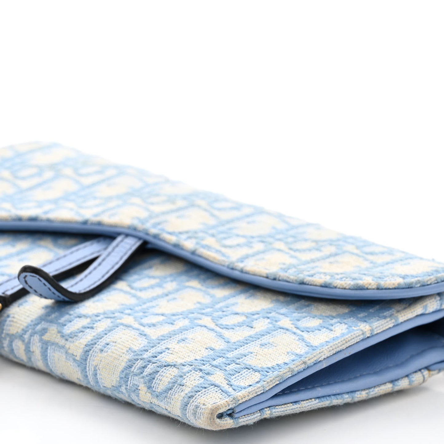 This is an authentic CHRISTIAN DIOR Oblique Saddle Chain Long Wallet in Cornflower Blue. This stylish wallet is crafted of blue on beige Dior monogram canvas. The wallet features a saddle-style crossover flap with a brass Dior D charm and a matching optional chain-link shoulder strap. The bag opens to a blue leather and fabric interior with card slots, patch pockets and a removable insert.