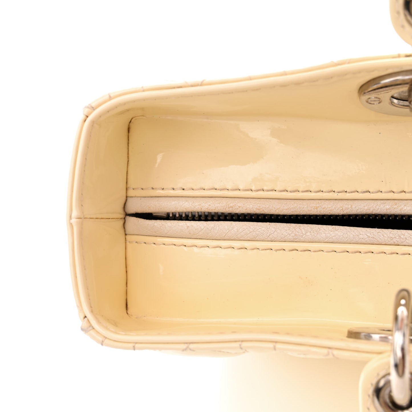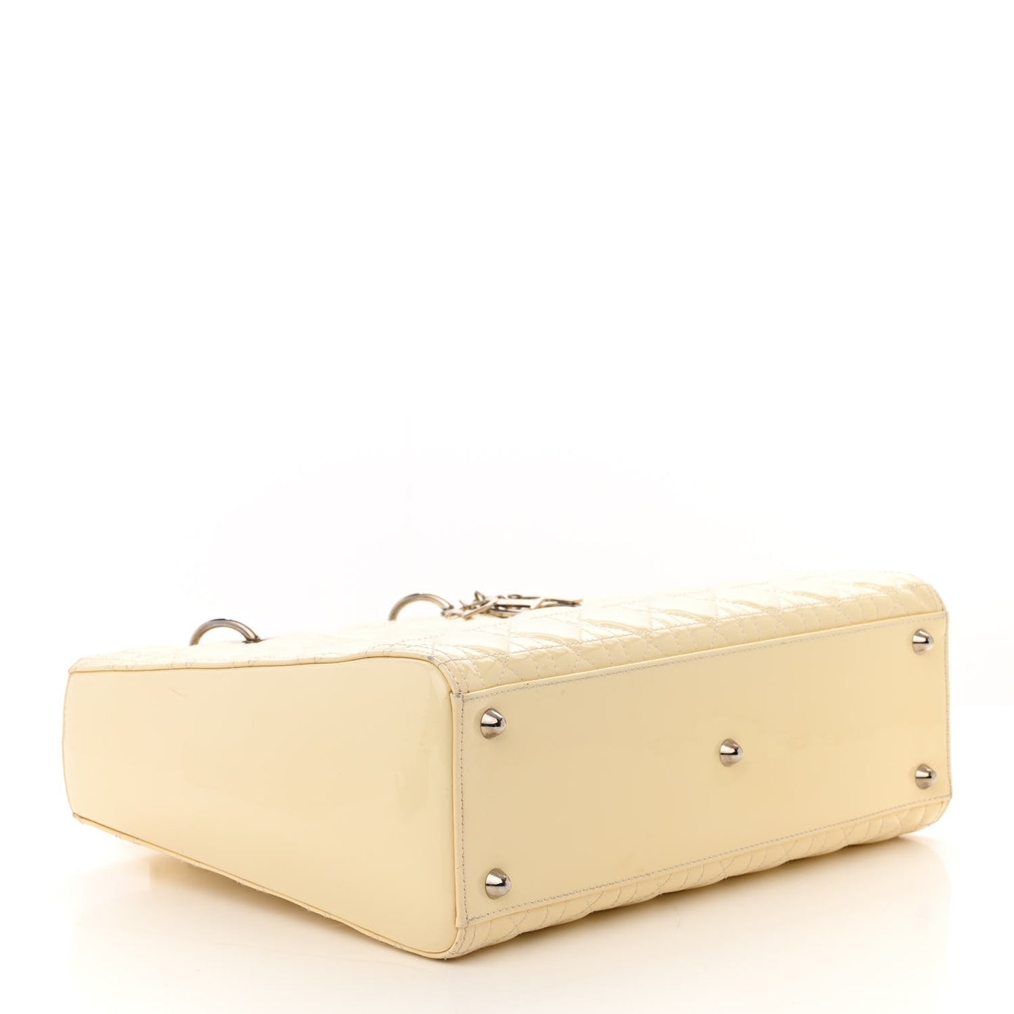 This is an authentic CHRISTIAN DIOR Patent Cannage Large Lady Dior in White. This stylish chic tote is crafted of geometric quilted patent leather in an off white. The handbag features sturdy leather top handles, and polished silver hardware including a hanging Dior initials logo charm. The top zipper opens to a grey Dior monogram jacquard fabric interior with a zipper pocket.Follow this item for alerts. Christian Dior is a registered trademark of Christian Dior. FASHIONPHILE is not affiliated with Christian Dior.