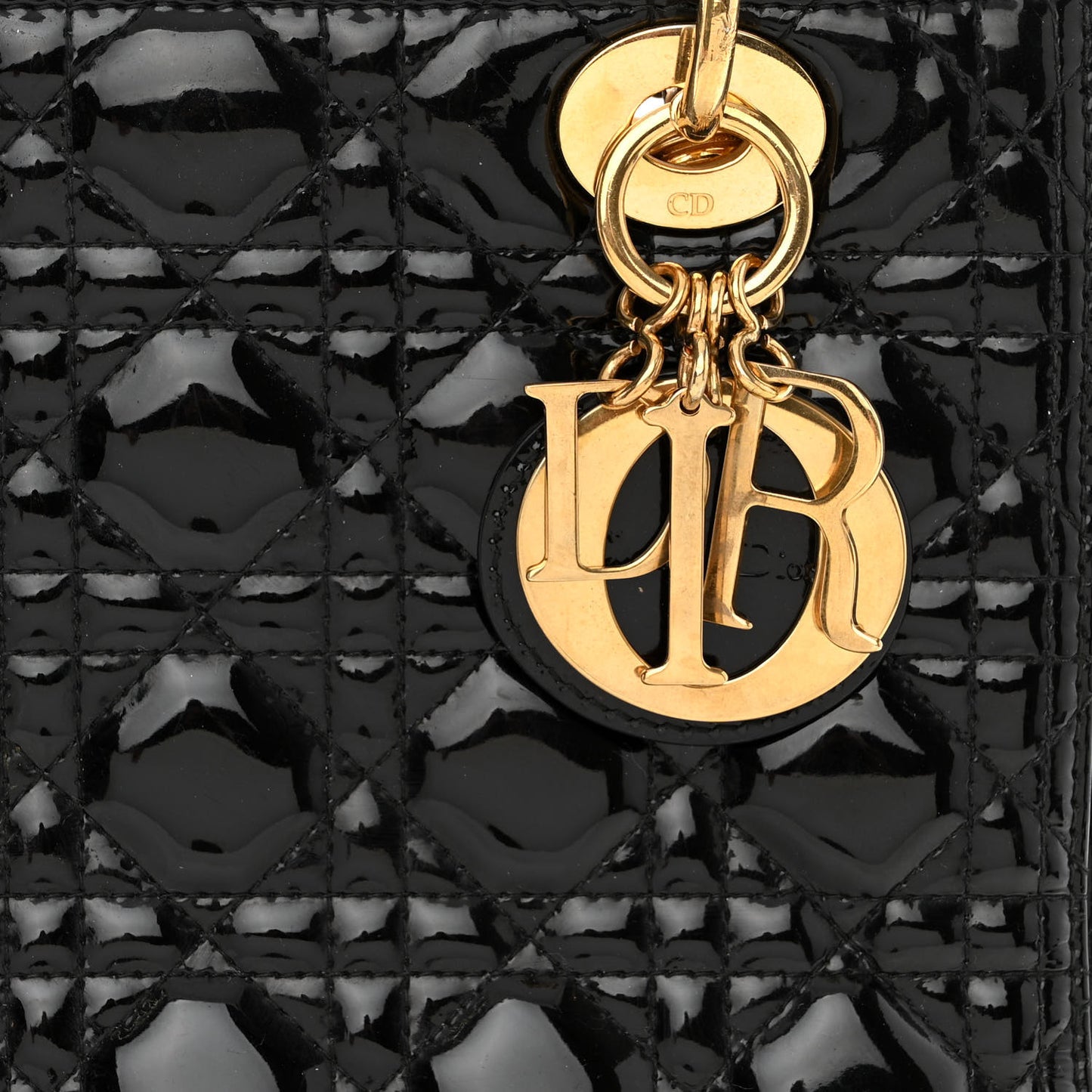 This is an authentic CHRISTIAN DIOR Patent Cannage Medium Lady Dior in Black. This chic tote is crafted of geometric quilted patent leather in black. The handbag features an optional adjustable shoulder strap, sturdy patent leather top handles with gold hardware, and hanging Dior logo charms. The top zipper opens to a gray monogrammed fabric interior with a zipper pocket.Follow this item for alerts. Christian Dior is a registered trademark of Christian Dior. FASHIONPHILE is not affiliated with Christian Dior.