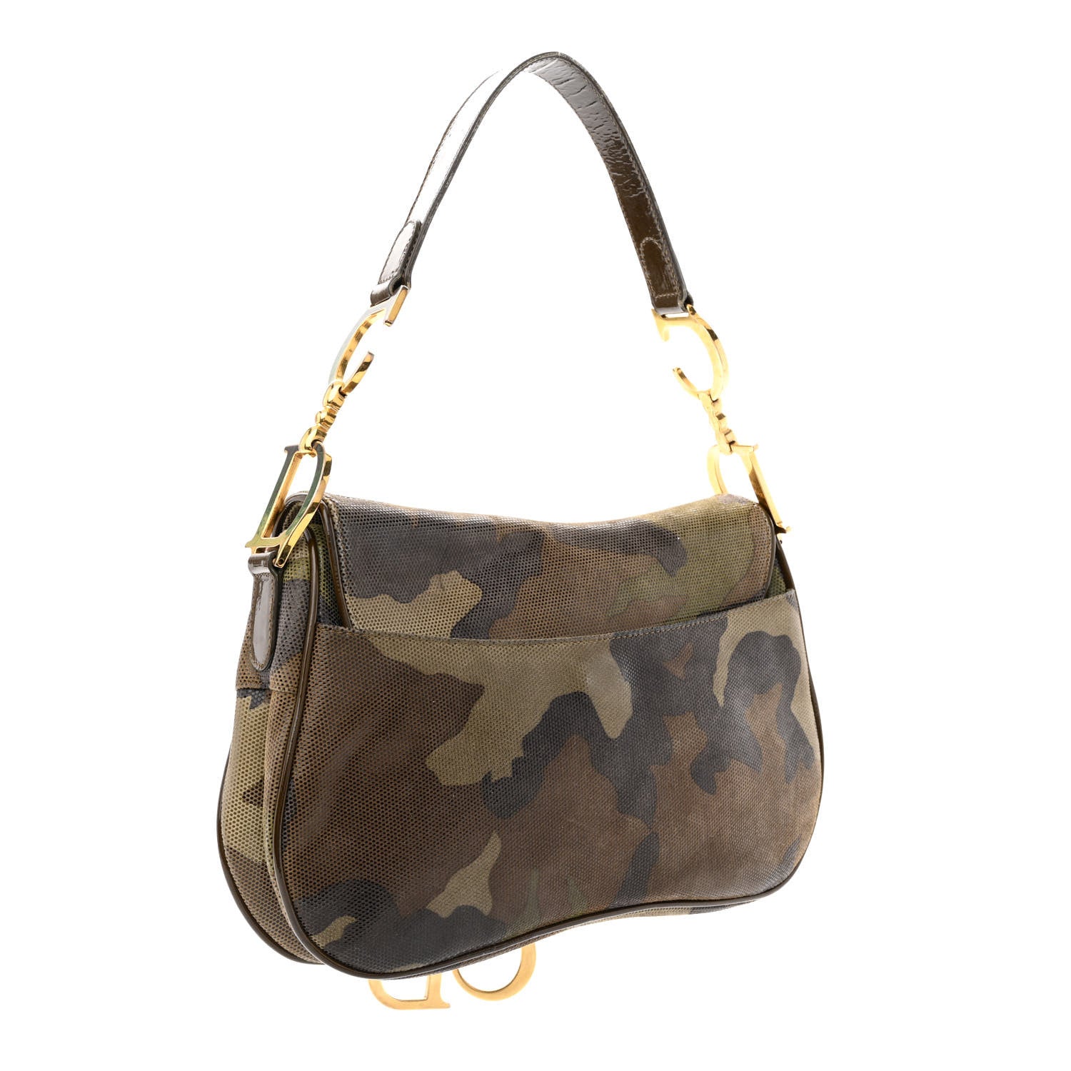 This is an authentic CHRISTIAN DIOR Pixelated Calfskin Camouflage Double Saddle Bag. This stylish saddle-style shoulder bag is crafted of shimmering pixelated camouflage leather. The bag features a looping patent leather shoulder strap in brown with Christian Dior initial links and hanging initial D charm of polished brass. The saddle flap opens to a dark green nylon interior with a zipper pocket.Follow this item for alerts. Christian Dior is a registered trademark of Christian Dior. FASHIONPHILE is not affiliated with Christian Dior.