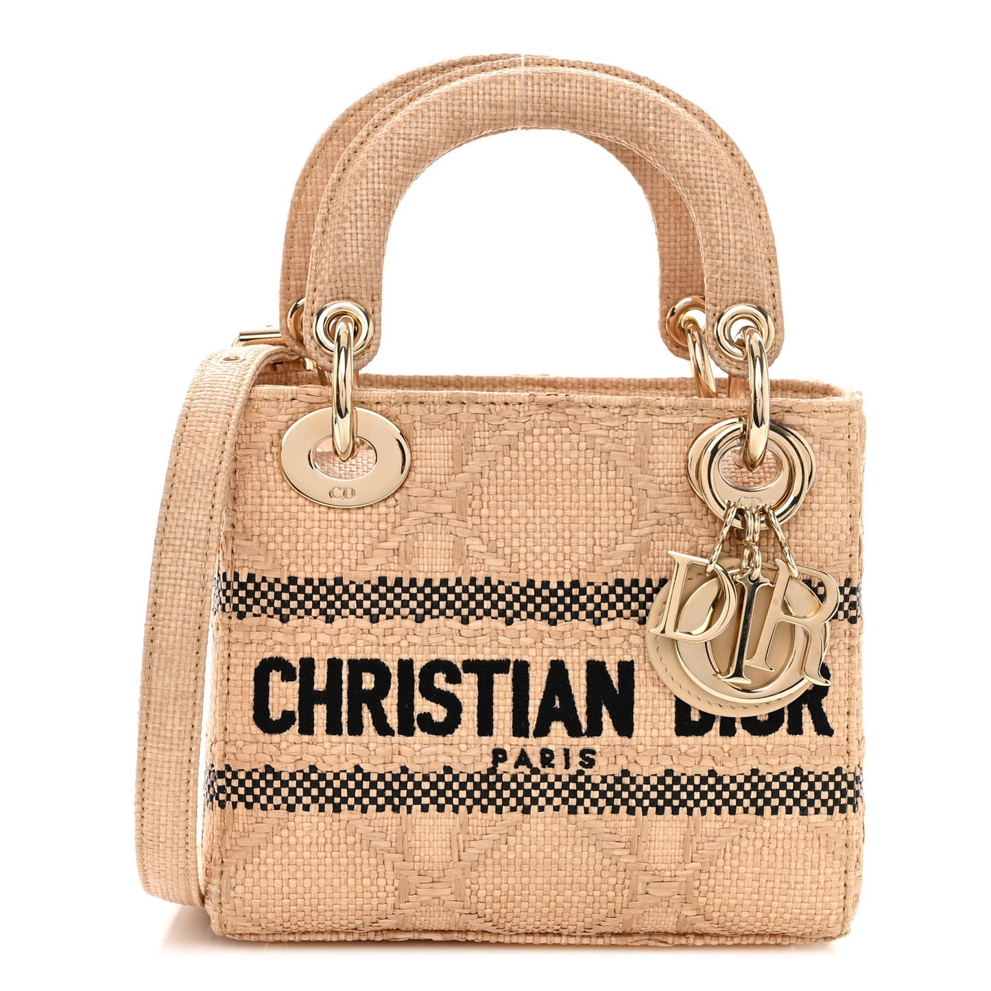 This is an authentic CHRISTIAN DIOR Raffia Woven Cannage Embroidered Mini Lady D-Lite in Natural and Black. This stylish handbag tote is finely crafted of woven raffia in the classic Cannage quilting with the 'Christian Dior' logo embroidered on the front. The bag features fabric top handles, an optional shoulder strap with gold hardware, including gold Dior letters charm. The top opens to a matching interior with a zipper pocket.Follow this item for alerts. Christian Dior is a registered trademark of Christian Dior. FASHIONPHILE is not affiliated with Christian Dior.