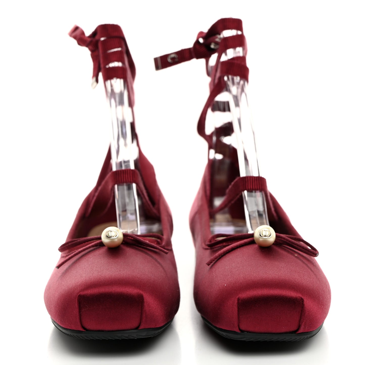 This is an authentic pair of CHRISTIAN DIOR Satin Grosgrain D-Joy Ballet Flats size 38 in Scarlet. These flats are crafted of dark red satin with a matching grosgrain fabric trim. They feature a satin bow with a faux pearl, and a structured squared toe.Follow this item for alerts. Christian Dior is a registered trademark of Christian Dior. FASHIONPHILE is not affiliated with Christian Dior.