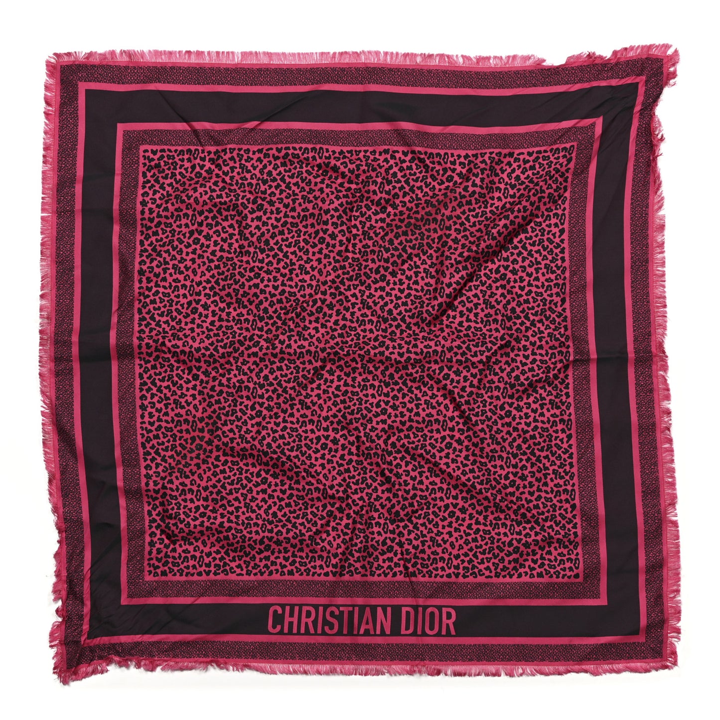This is an authentic CHRISTIAN DIOR Silk Leopard Print Fringe Scarf in Pink. This silk and polyester blend scarf features the Christian Dior logo on a black and pink background and fringed ends.Follow this item for alerts. Christian Dior is a registered trademark of Christian Dior. FASHIONPHILE is not affiliated with Christian Dior.