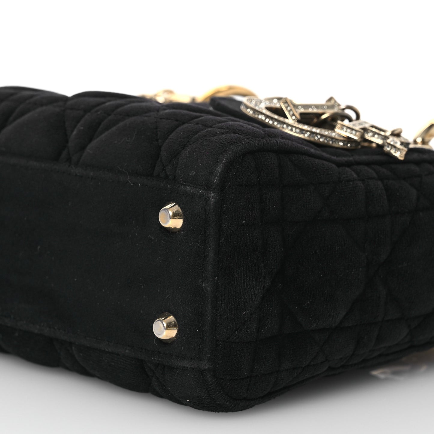 This is an authentic CHRISTIAN DIOR Velvet Mini Lady Dior in Black. This beautiful tote is crafted of geometric-quilted velvet in black. The bag features an optional light gold chain shoulder strap and it has smooth velvet top handles that are rolled and reinforced with matching gold links. The bag also has crystal-encrusted charms that spell DIOR. The top flap opens to a black velvet interior with a zipper pocket.Follow this item for alerts. Christian Dior is a registered trademark of Christian Dior. FASHIONPHILE is not affiliated with Christian Dior.