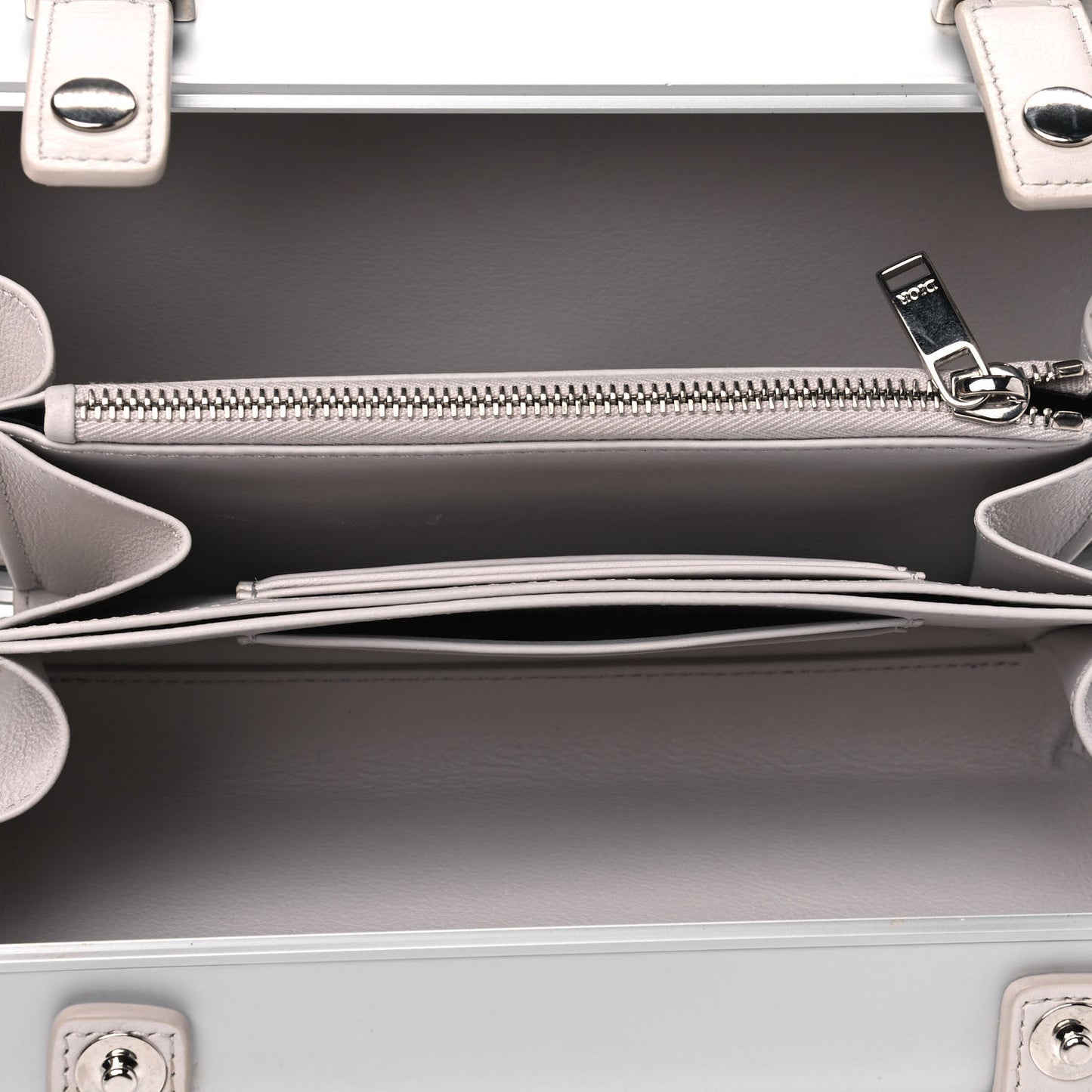 This is an authentic CHRISTIAN DIOR X RIMOWA Aluminum Personal Clutch On Strap in Silver. This chic Dior x Rimowa clutch is crafted from lightweight aluminum in silver. It features 'Christian Dior' logo-debossed leather straps that fasten around the bag with snap buttons, an optional shoulder strap, and polished silver hardware. The top snaps open to a leather interior with card slots, zipper and patch pockets.Follow this item for alerts. Christian Dior is a registered trademark of Christian Dior. FASHIONPHILE is not affiliated with Christian Dior.