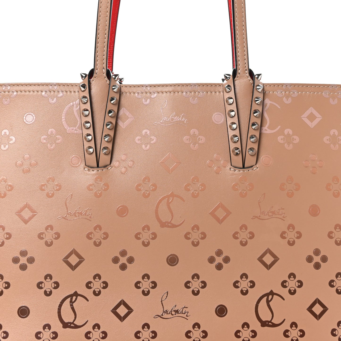 This is an authentic CHRISTIAN LOUBOUTIN Calfskin Patent Degrade Loubinthesky East West Cabata Tote in Nude. This chic tote is crafted of smooth leather with gradient brown printed logos. It features leather strap handles with silver studs accents and an embossed logo script across the base. The top is open to a red leather interior with a matching removable pouch.Follow this item for alerts. Christian Louboutin is a registered trademark of Christian Louboutin. FASHIONPHILE is not affiliated with Christian Louboutin.