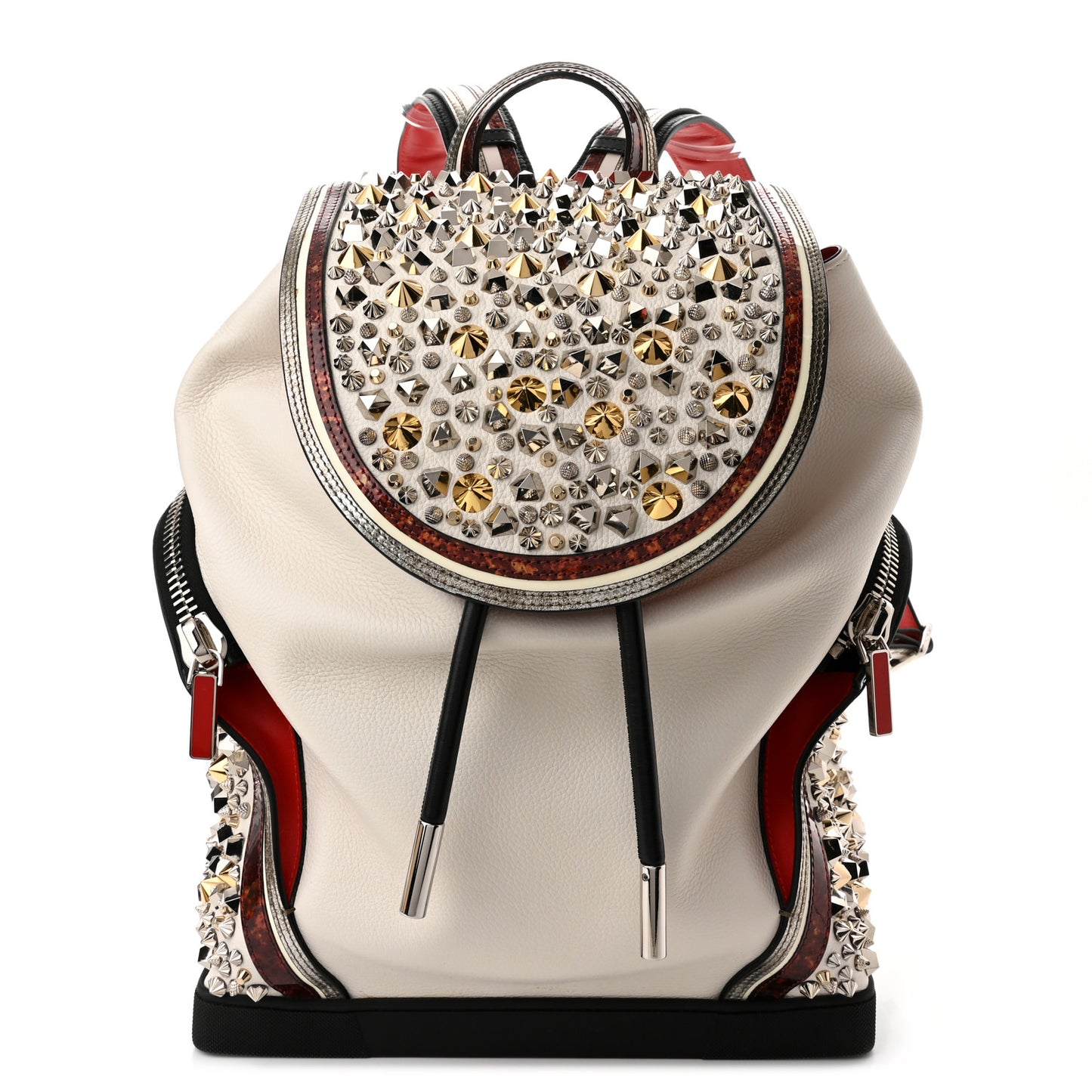 This is an authentic CHRISTIAN LOUBOUTIN Calfskin Spiked Explorafunk Backpack. This chic backpack is crafted of grained calfskin leather in white with silver and gold studs. The bag features leather shoulder straps, zippered pockets on both sides, a top leather cinch cord, and a solid red rubber base. The flap opens to a black fabric interior with a zipper pocket.Follow this item for alerts. Christian Louboutin is a registered trademark of Christian Louboutin. FASHIONPHILE is not affiliated with Christian Louboutin.