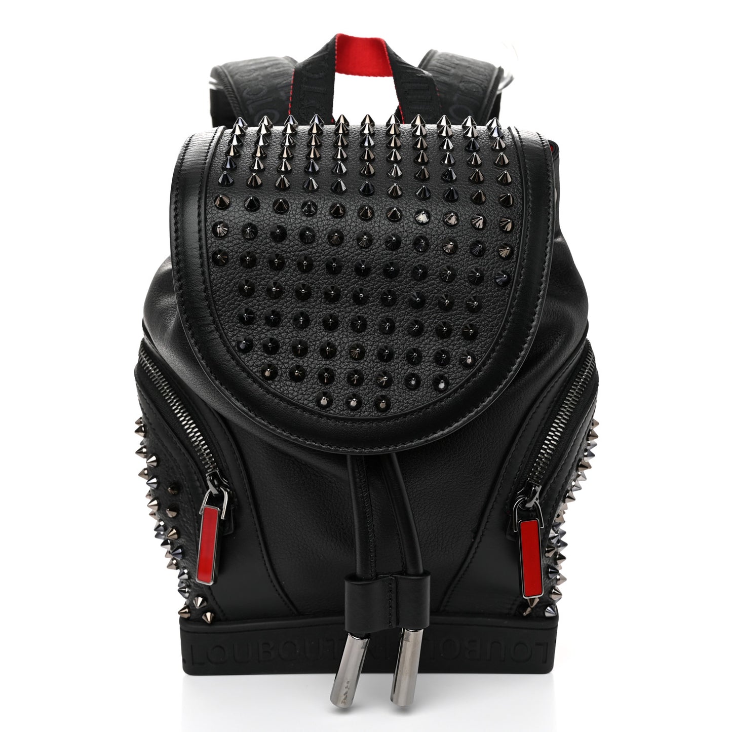 This is an authentic CHRISTIAN LOUBOUTIN Calfskin Spiked Small Explorafunk Backpack in Black. This chic backpack is crafted of grained calfskin leather in black with silver studs. The bag features leather shoulder straps, two zippered pockets on both sides, a top leather cinch cord, and a solid red rubber base. The flap opens to a red fabric interior with zipper and patch pockets.