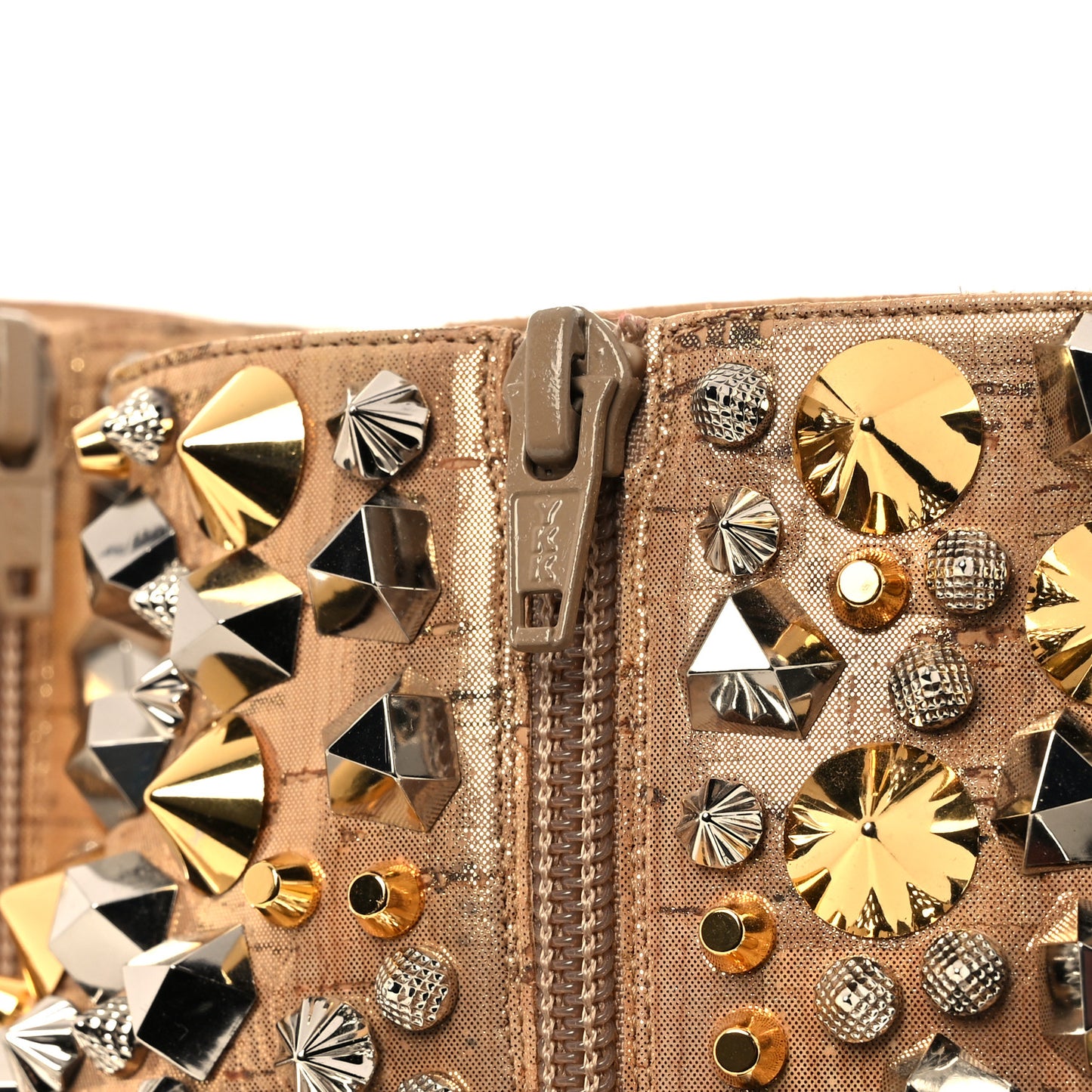 This is an authentic pair of CHRISTIAN LOUBOUTIN Liege Pepite Specchio So Full Kate 100 Ankle Boots size 37 in Gold and Multicolor. These chic ankle booties are crafted of fabric, completely covered in multicolored and multi shaped spikes. The boots feature a pointed toe, a 4.5-inch wrapped stiletto heel, a zipper at the instep, and signature Louboutin red lacquered soles.Follow this item for alerts. Christian Louboutin is a registered trademark of Christian Louboutin. FASHIONPHILE is not affiliated with Christian Louboutin.