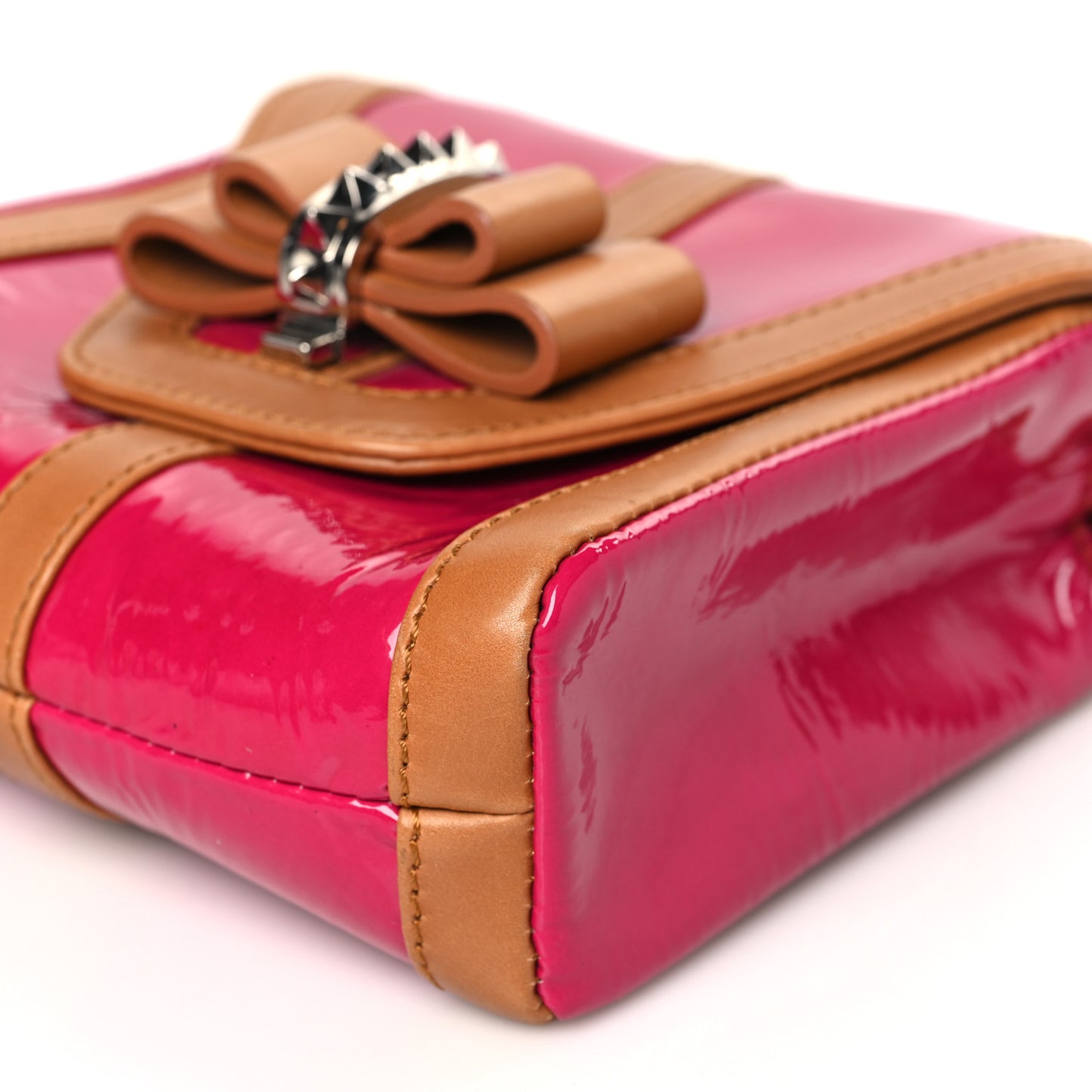 This is an authentic CHRISTIAN LOUBOUTIN Patent Calfskin Sweety Charity Crossbody Bag in Pink. This chic crossbody is crafted of pink patent leather with brown leather trim and bow detail on the front. The bag features a silver chainlink shoulder strap and spike detail. The crossover flap opens to a red fabric interior with a patch pocket.Follow this item for alerts. Christian Louboutin is a registered trademark of Christian Louboutin. FASHIONPHILE is not affiliated with Christian Louboutin.
