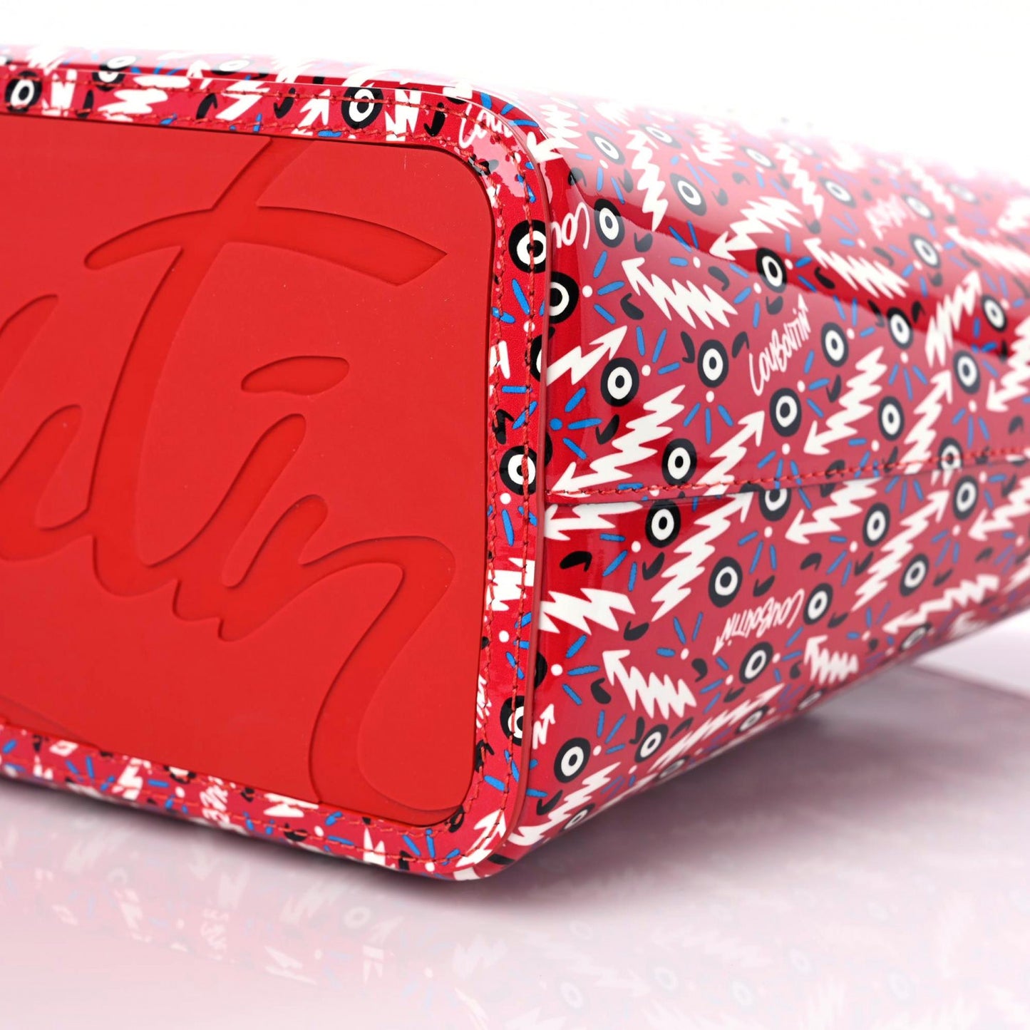 This is an authentic CHRISTIAN LOUBOUTIN Patent Ginzana Cabata Tote in Loubi. This chic tote is crafted of patent leather with a graphic prints. It features leather strap handles with silver studs accents and an embossed logo script across the base. The top is open to a red leather interior with a matching removable pouch.