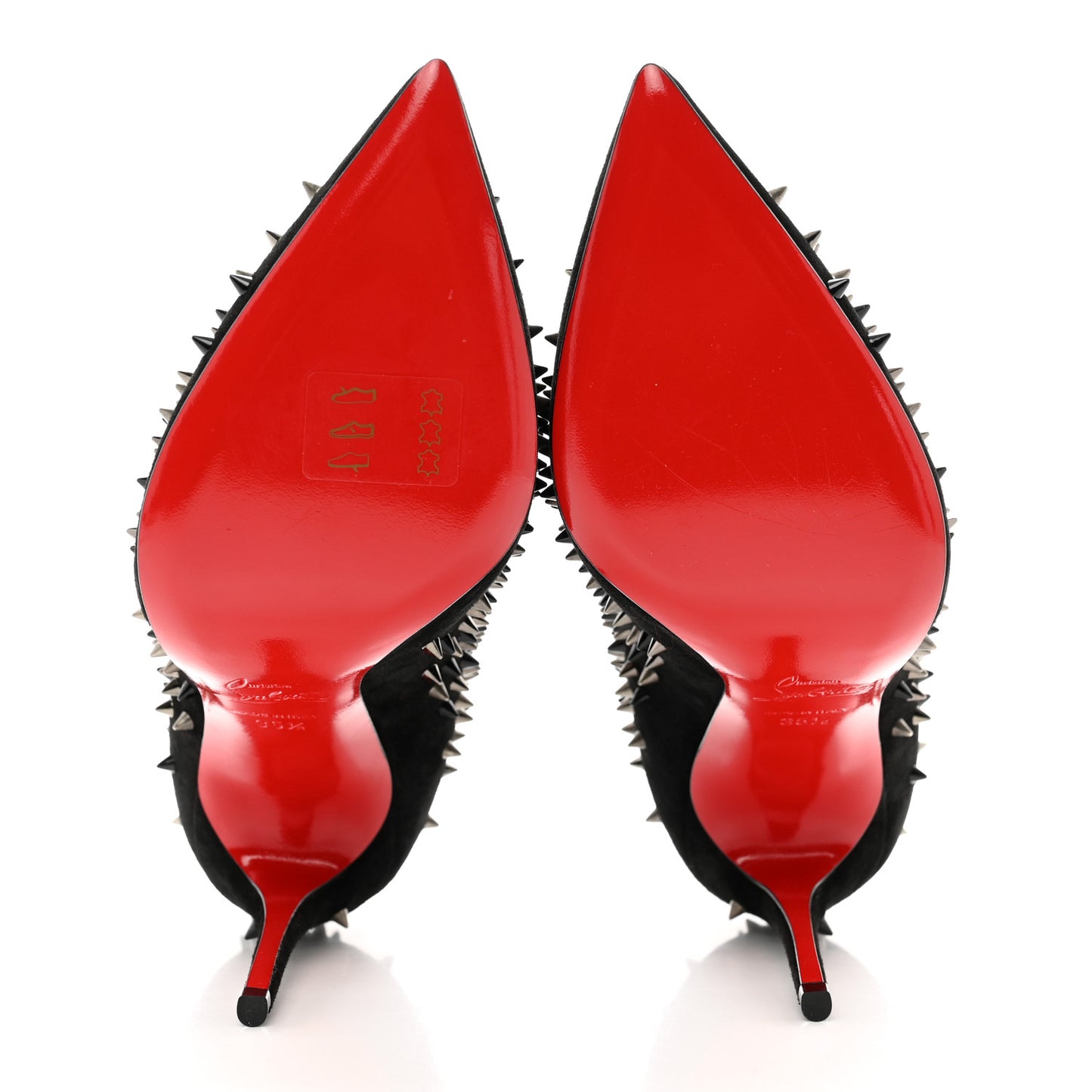 These are authentic CHRISTIAN LOUBOUTIN Veau Velours Studded Escarpic 100 Pumps size 35.5 in Black. These stylish pumps are structured of black suede leather with gunmetal and black spikes. These feature a 4- inch wrapped stiletto, pointed toe and signature red lacquered sole.Follow this item for alerts. Christian Louboutin is a registered trademark of Christian Louboutin. FASHIONPHILE is not affiliated with Christian Louboutin.