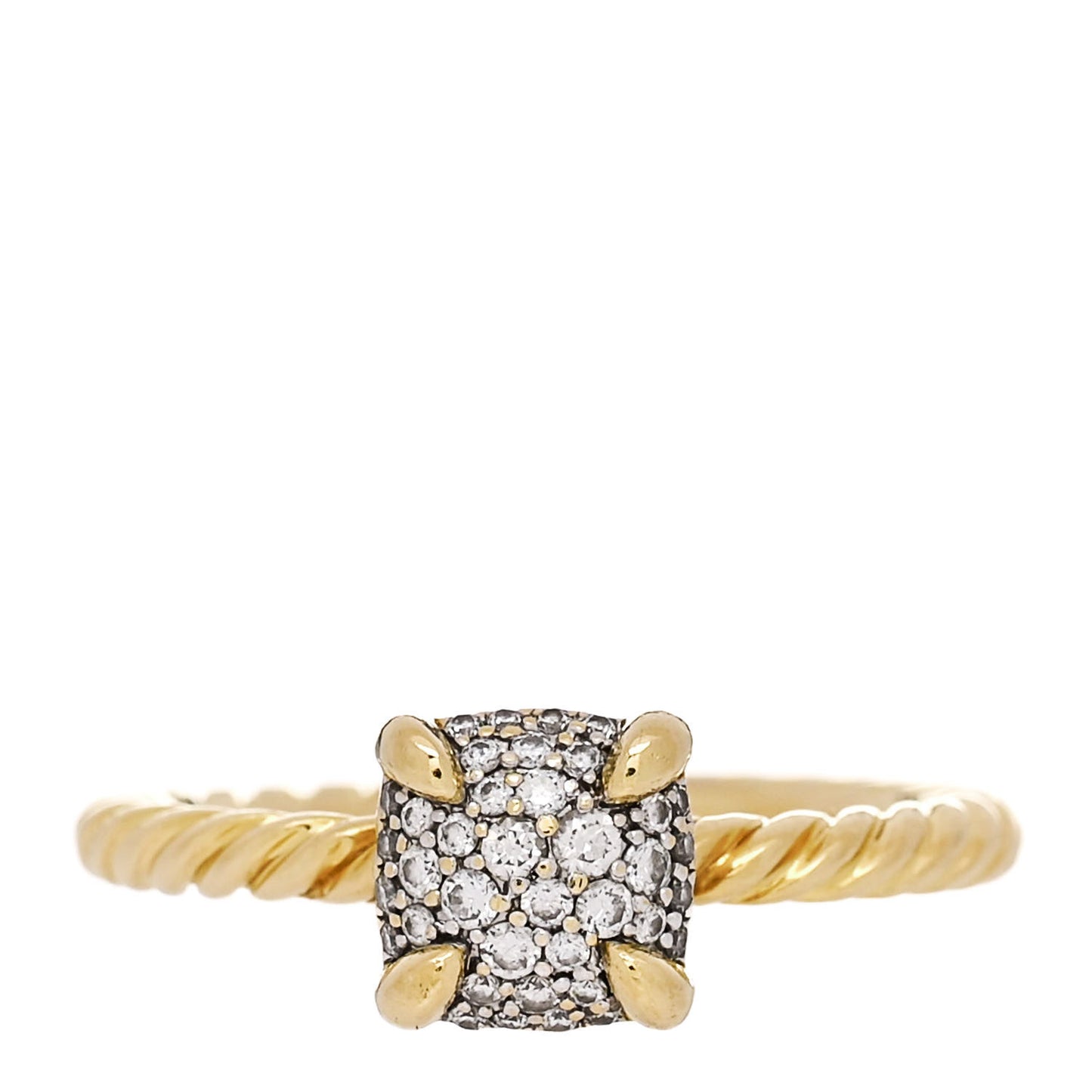 This is an authentic DAVID YURMAN 18K Yellow Gold Diamond 7mm Chatelaine Pave Ring size 50 or 5.5. The ring is crafted of 18 karat yellow gold and features a twisted cable style band with a cushion motif set with pave diamonds weighing approximately .16 total carat weight.Follow this item for alerts. David Yurman is a registered trademark of David Yurman. FASHIONPHILE is not affiliated with David Yurman.