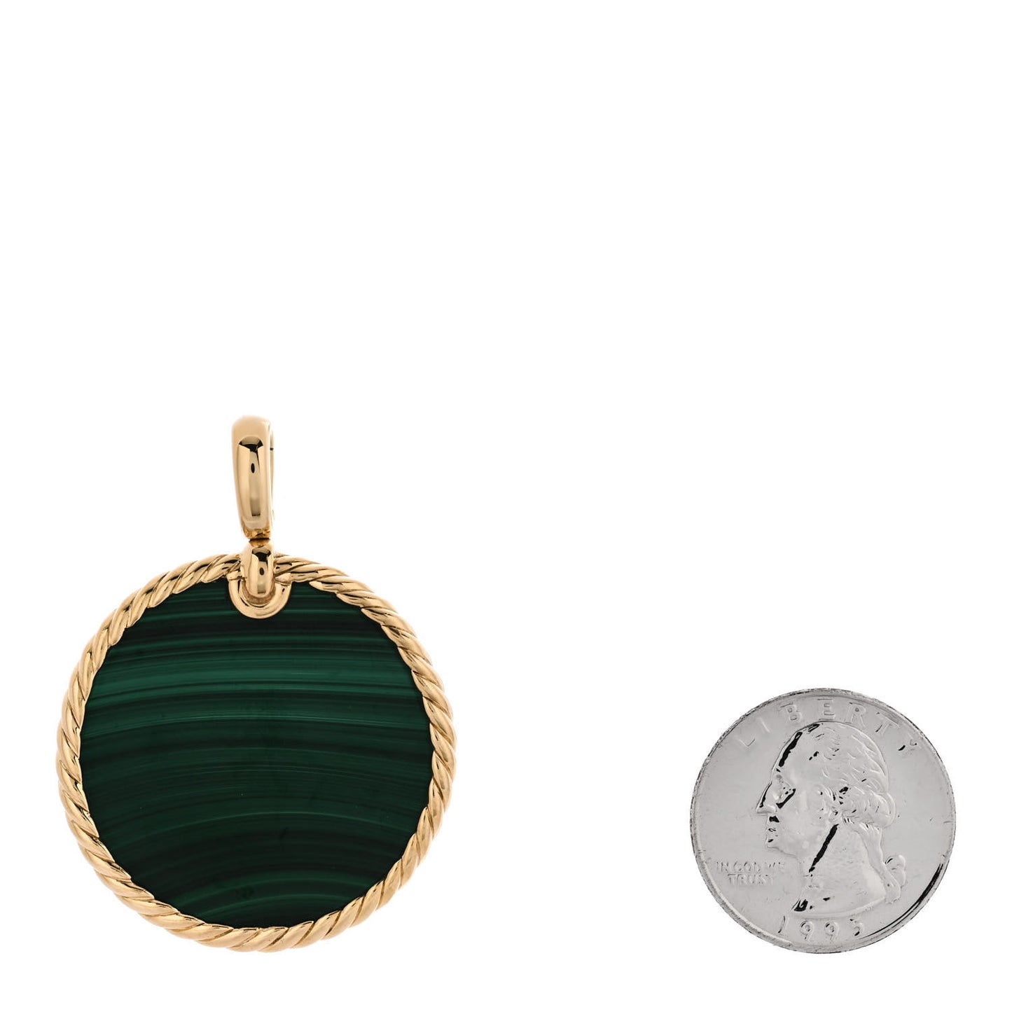 This is an authentic DAVID YURMAN 18K Yellow Gold Malachite Elements Disc Pendant. The pendant is crafted of 18 karat yellow gold and features a cable accented disc set with malachite.Follow this item for alerts. David Yurman is a registered trademark of David Yurman. FASHIONPHILE is not affiliated with David Yurman.