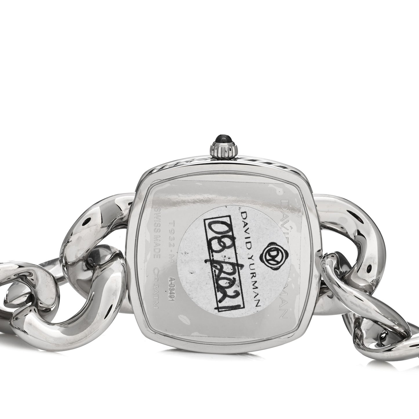 This is an authentic DAVID YURMAN Stainless Steel Diamond 27mm Albion Quartz Watch Black. The watch is crafted of stainless steel and features a black dial with Roman numeral and diamond hour markers, black cabochon crown, sapphire crystal, curb link chain bracelet, and a quartz movement.Follow this item for alerts. David Yurman is a registered trademark of David Yurman. FASHIONPHILE is not affiliated with David Yurman.