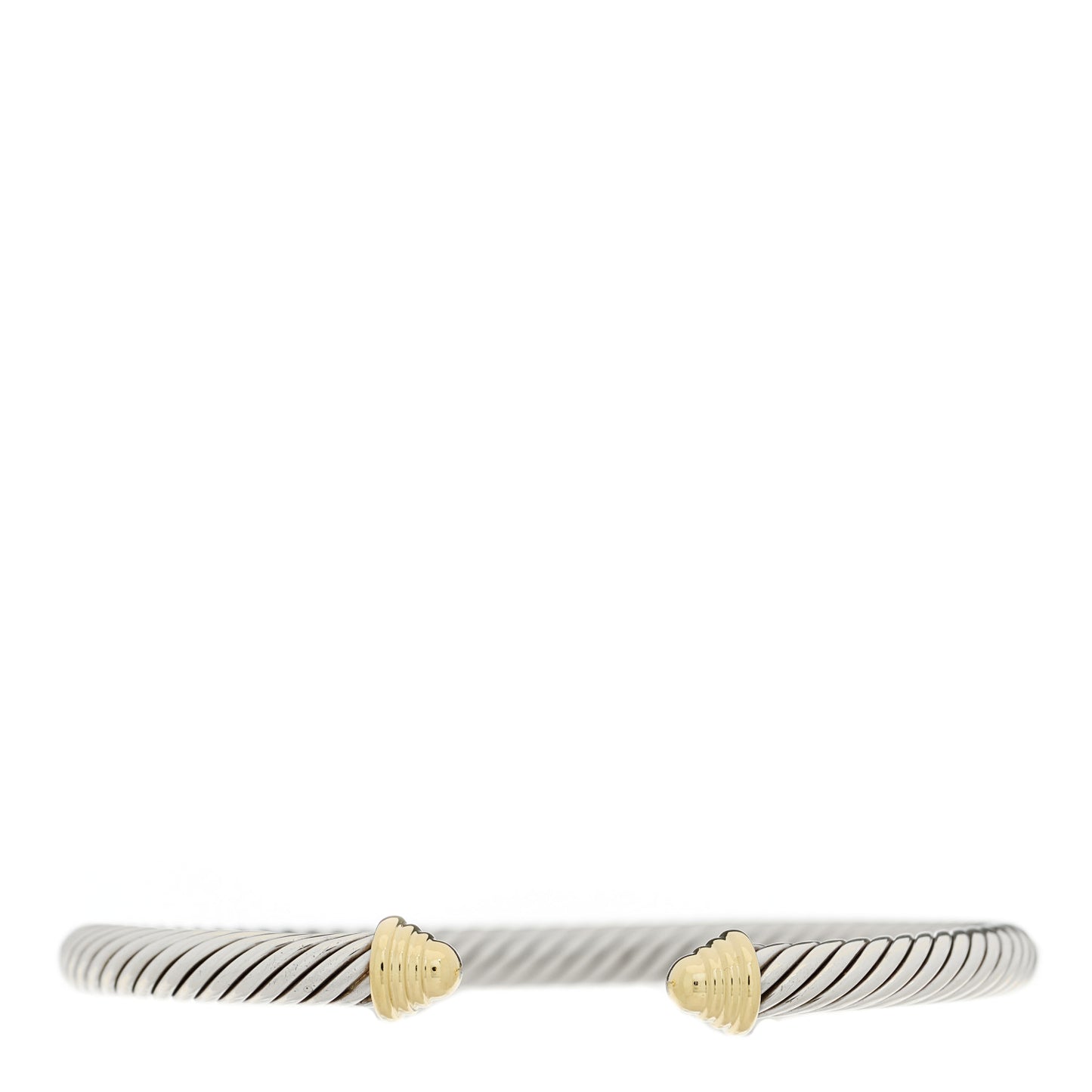 This is an authentic DAVID YURMAN Sterling Silver 14K Yellow Gold 5mm Cable Classics Bracelet. The bracelet is crafted of sterling silver and 14 karat yellow gold, and features a cable motif open cuff with gold domes on the ends.Follow this item for alerts. David Yurman is a registered trademark of David Yurman. FASHIONPHILE is not affiliated with David Yurman.
