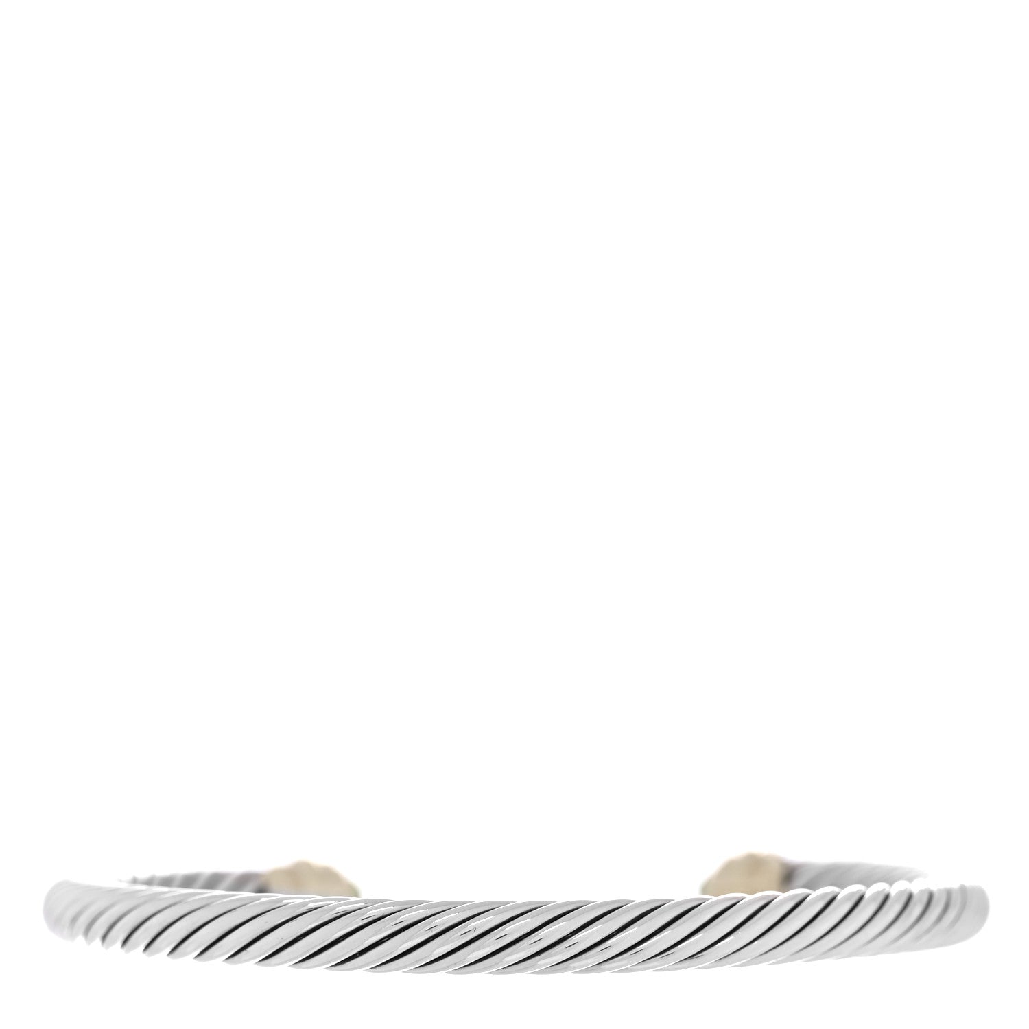 This is an authentic DAVID YURMAN Sterling Silver 14K Yellow Gold Peridot 5mm Cable Classics Petite Color Bracelet. The bracelet is crafted of sterling silver and 14 karat yellow gold, and features a twisted cable motif open cuff set with faceted peridot on each end.