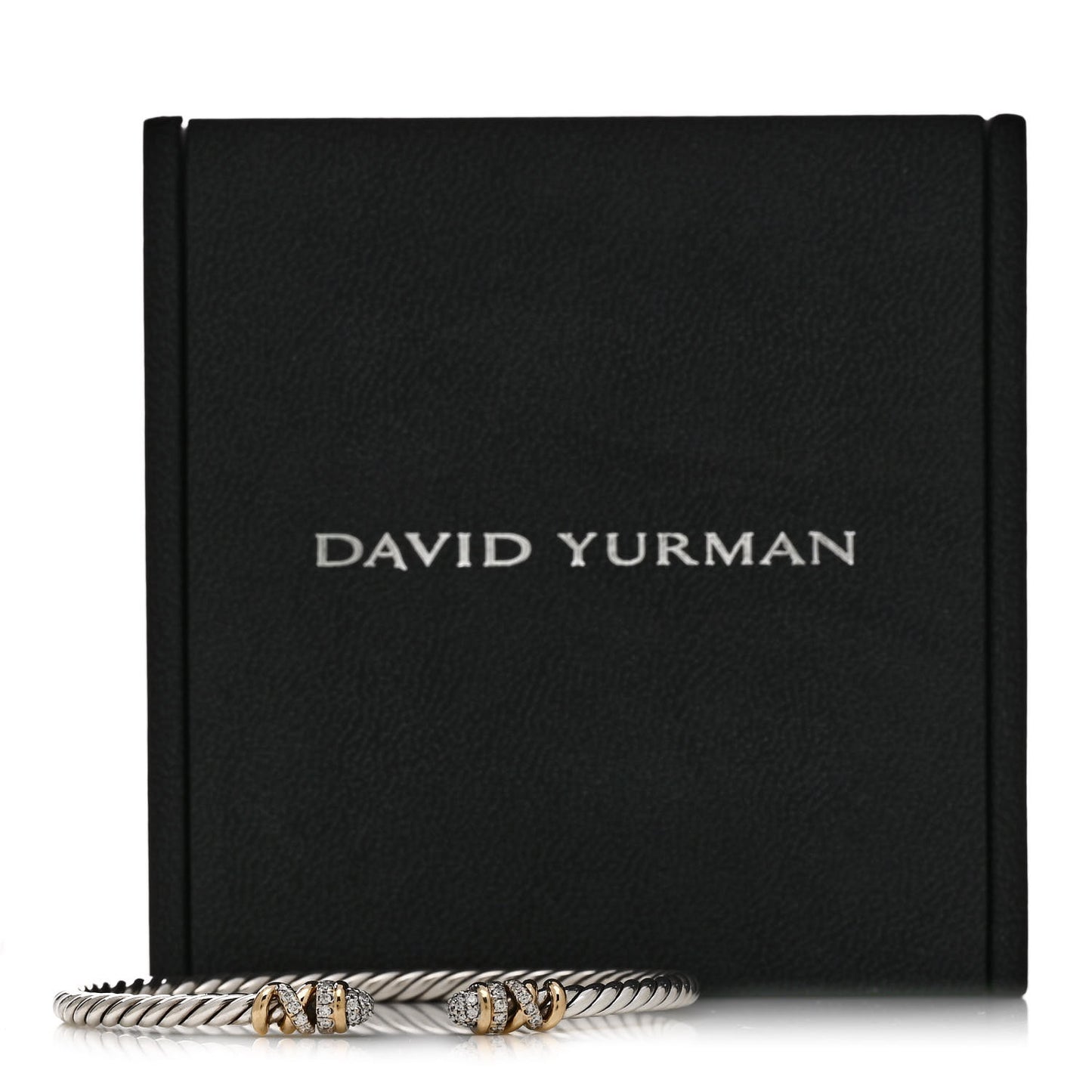This is an authentic DAVID YURMAN Sterling Silver 18K Yellow Gold Diamond 3mm Petite Helena Cuff Bracelet. The bracelet is crafted of sterling silver twisted cable-style and features an 18k yellow gold pave set diamonds weighing approximately .30 total carat weight.