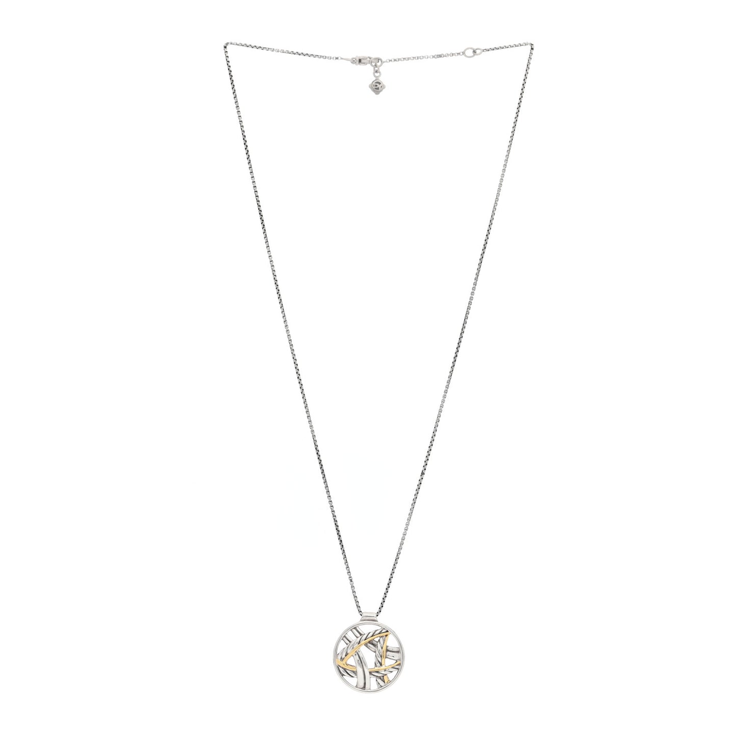 This is an authentic DAVID YURMAN Sterling Silver 18K Yellow Gold Papyrus Pendant Necklace, The necklace is crafted of sterling silver and 18 karat yellow gold and features a round pendant with gold and silver cables overlapping each other. PLEASE NOTE: The chain has been repaired with an added jump ring.Follow this item for alerts. David Yurman is a registered trademark of David Yurman. FASHIONPHILE is not affiliated with David Yurman.