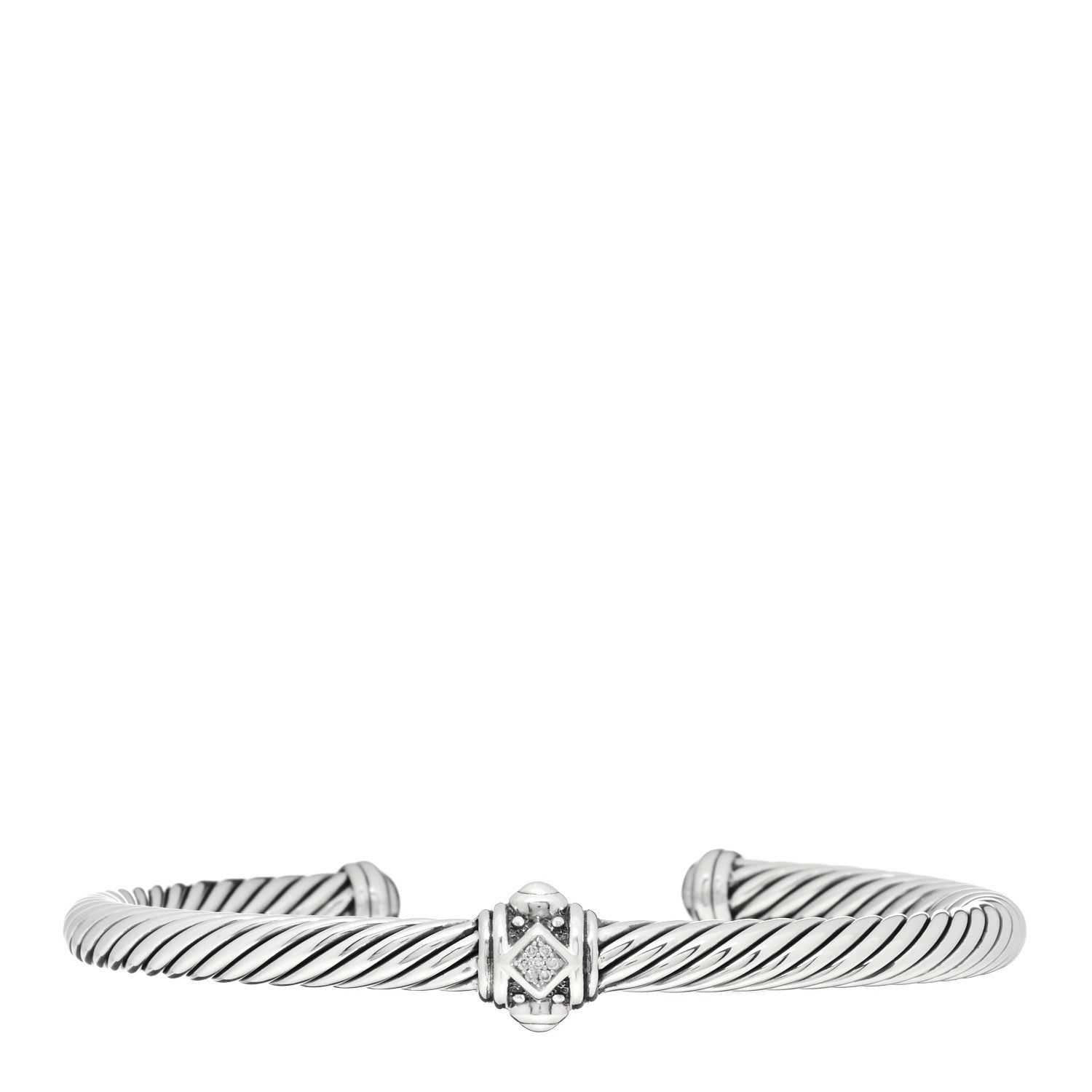 This is an authentic DAVID YURMAN Sterling Silver Diamond 5mm Cable Renaissance Station Bracelet. The bracelet is crafted of sterling silver and features a cable motif open cuff accented with a Renaissance motif station set with round brilliant cut diamonds, approximately .02 total carat weight.Follow this item for alerts. David Yurman is a registered trademark of David Yurman. FASHIONPHILE is not affiliated with David Yurman.