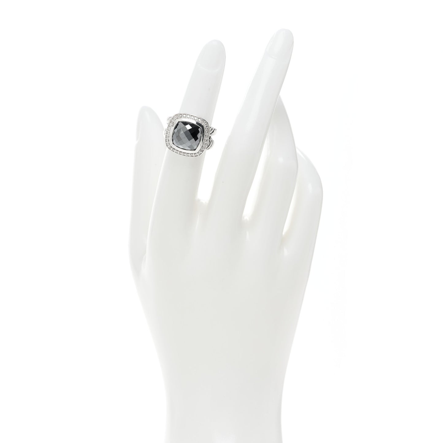 This is an authentic DAVID YURMAN Sterling Silver Diamond Hematite 11mm Albion Ring size 48 or 4.5. The ring is crafted of sterling silver and features an 11mm hematite center stone framed by pave set diamonds weighing approximately .32 total carat weight.