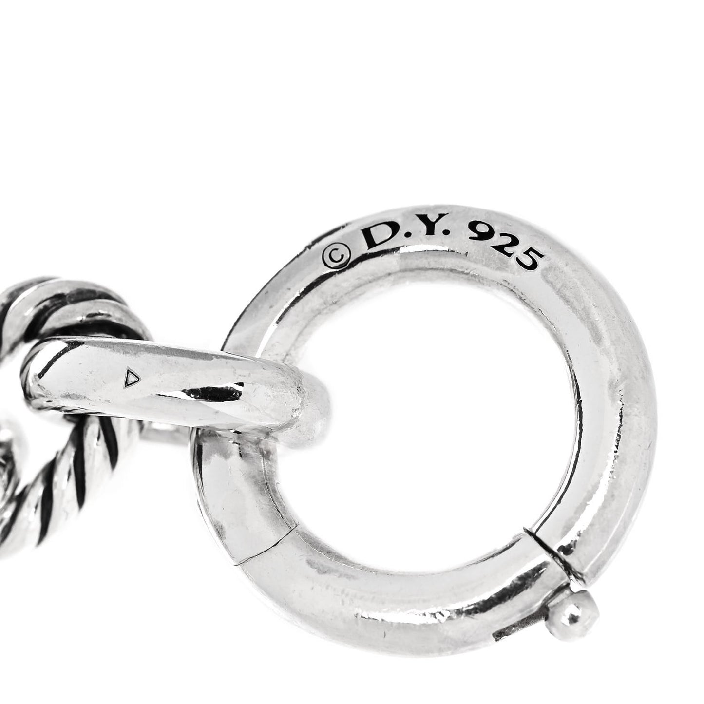 This is an authentic DAVID YURMAN Sterling Silver Diamond Lexington Chain Bracelet. The bracelet is crafted of sterling silver and features the signature twisted cable motif link and elongated links with a diamond embellished toggle closure weighing approximately .24 total carat weight.