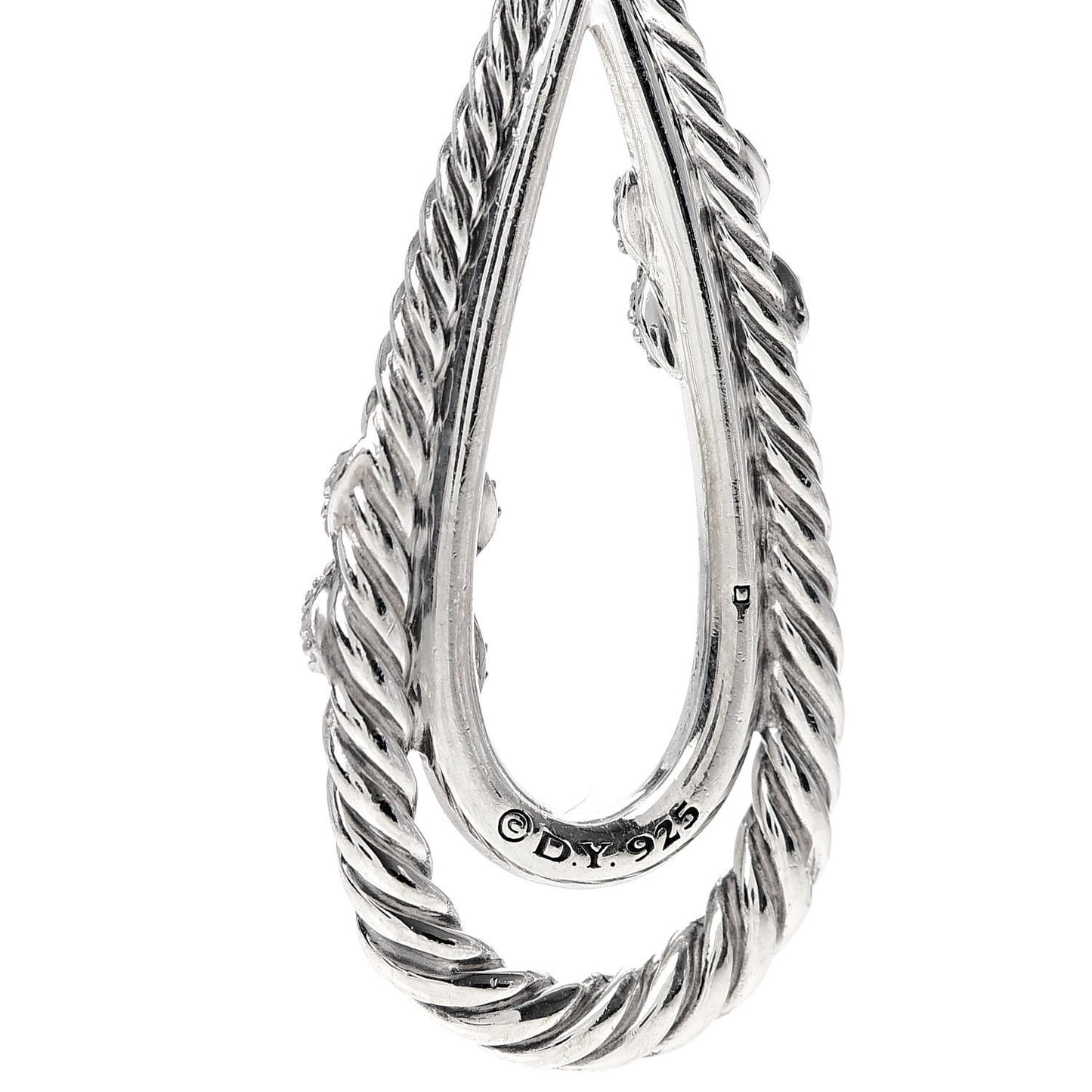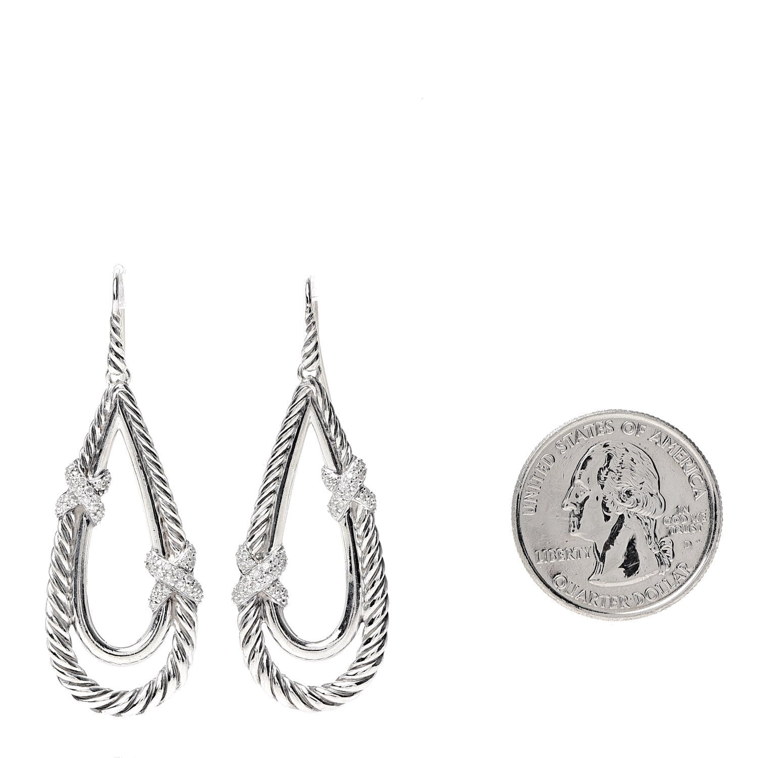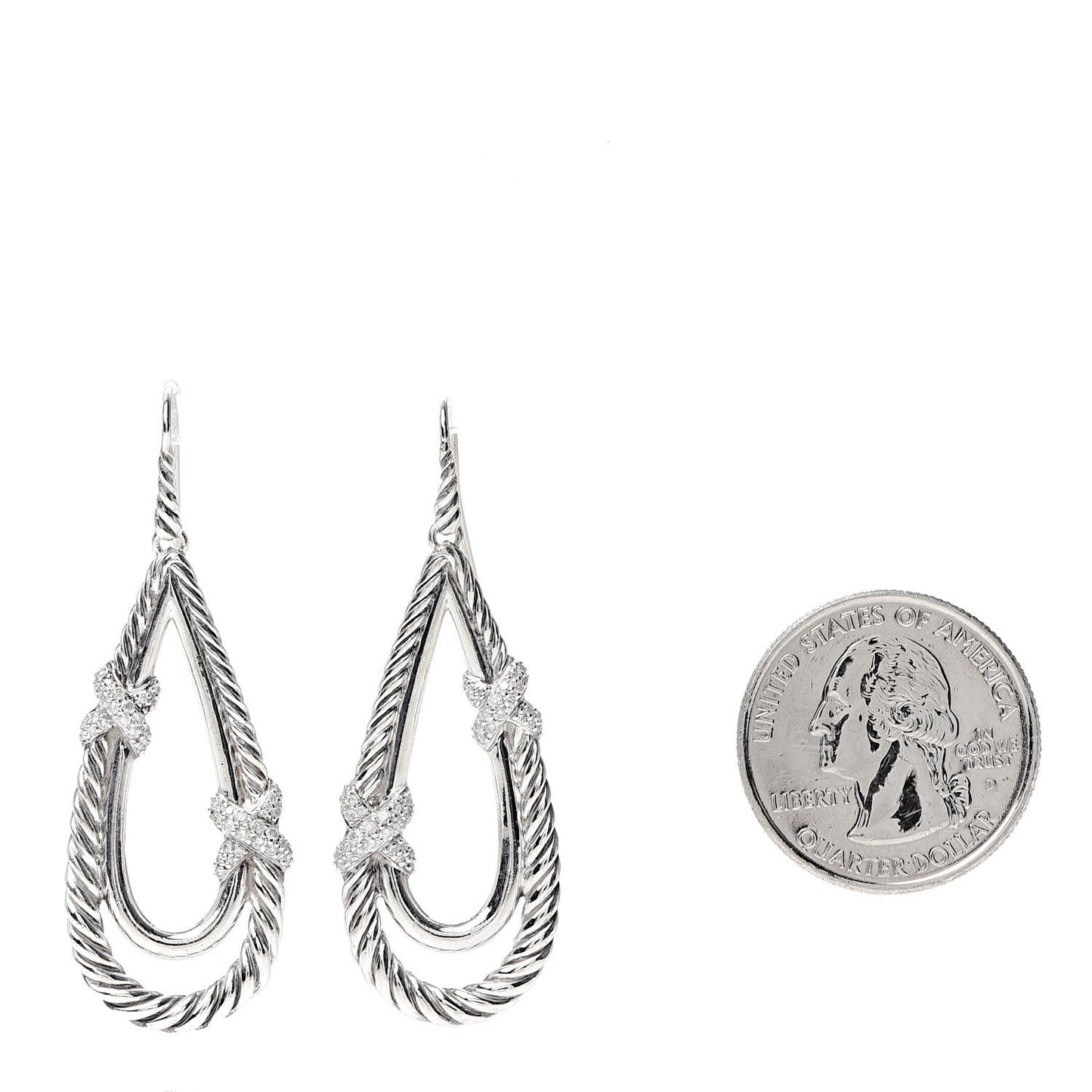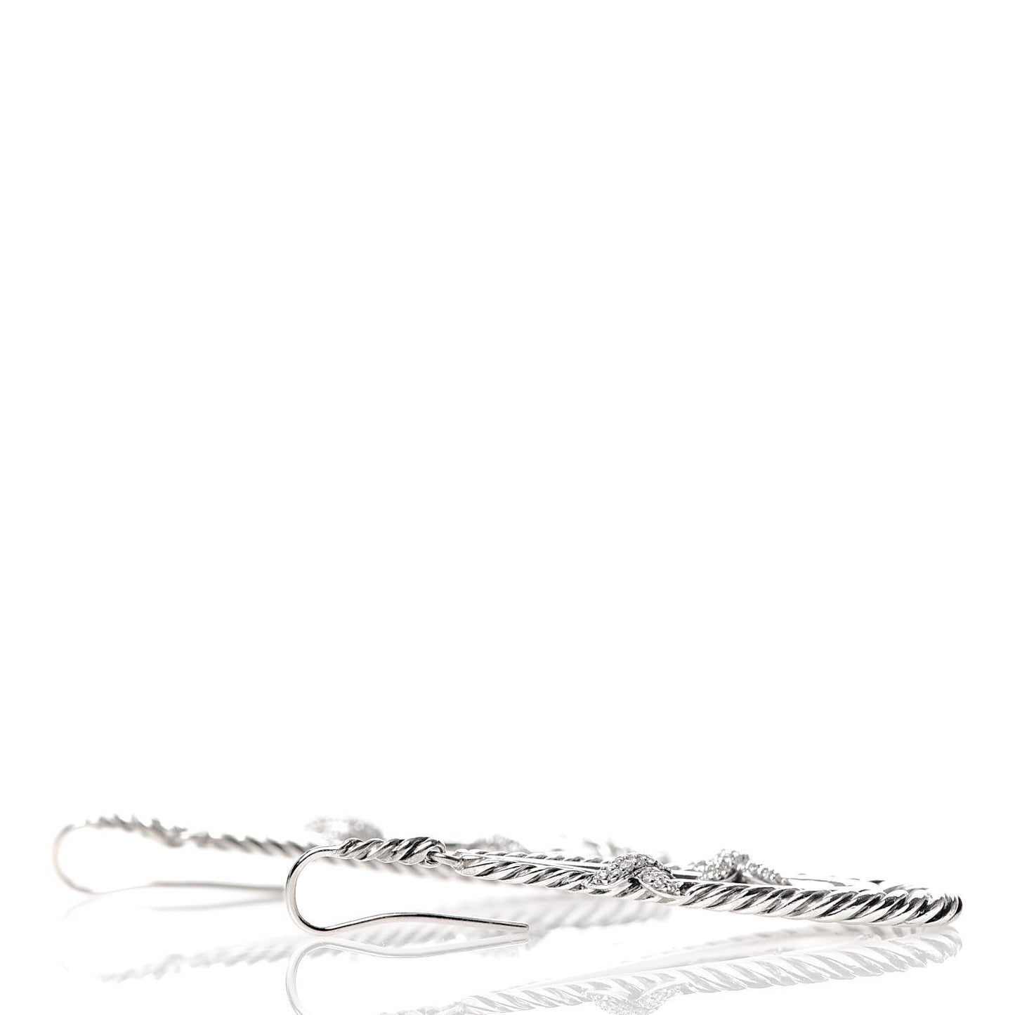 This is an authentic pair of DAVID YURMAN Sterling Silver Diamond X Drop Earrings. These stunning hoop earrings are crafted of sterling silver and feature an oval cable style drop lined with a smooth oval inside and bound together by two pave diamond encrusted X on both sides, with an approximate .48 total carat weight. An elegant pair, these earrings will be an effortless touch to any ensemble with a look of distinction only from David Yurman!Follow this item for alerts. David Yurman is a registered trademark of David Yurman. FASHIONPHILE is not affiliated with David Yurman.