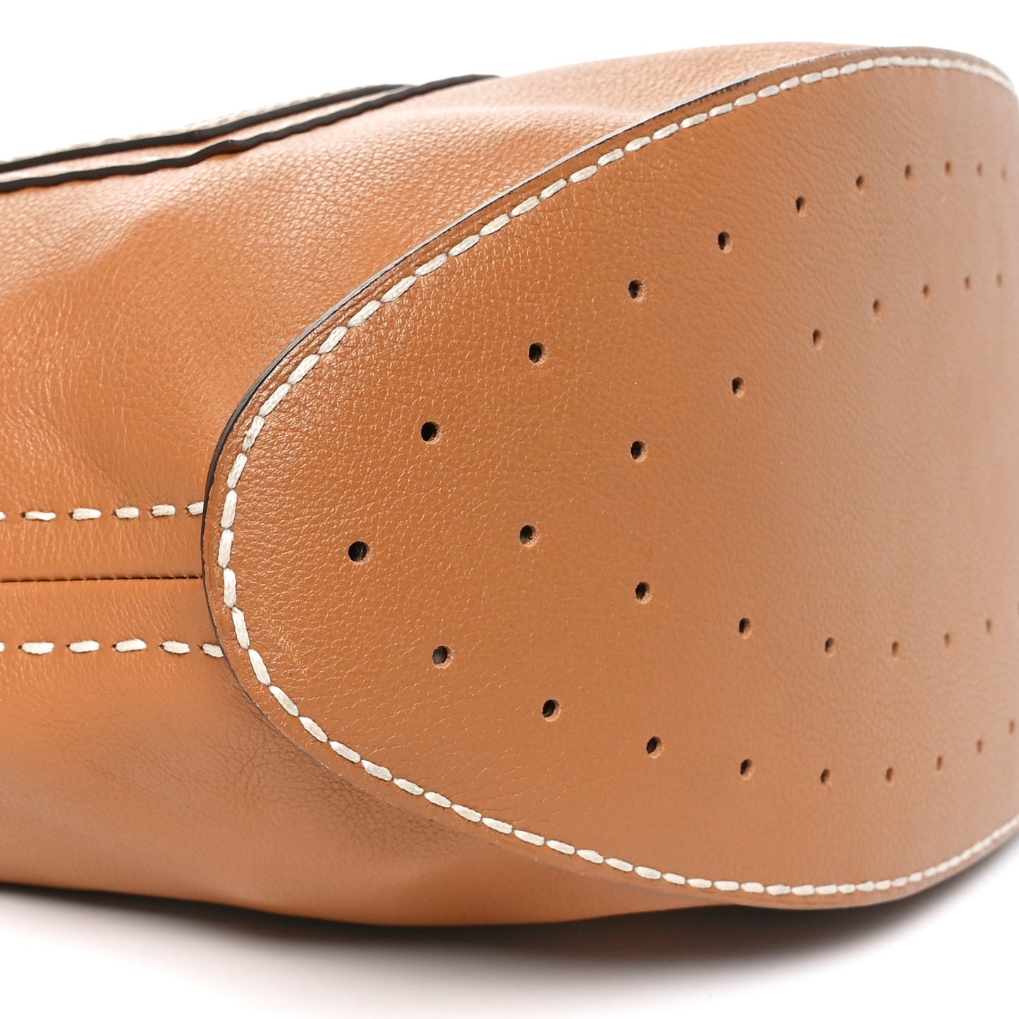 This is an authentic DELVAUX Taurillon Pin Surpique Bucket GM in Vegetal and Ivory. This stylish bag is crafted of grained calfskin leather in brown with contrasting white stitching. It features a perforated base, a long leather shoulder strap, a front pocket shaped like the letter "D" and polished gold hardware. The bag has an open top and a matching suede leather interior with a leather hanging patch pocket.Follow this item for alerts. Delvaux is a registered trademark of Delvaux. FASHIONPHILE is not affiliated with Delvaux.