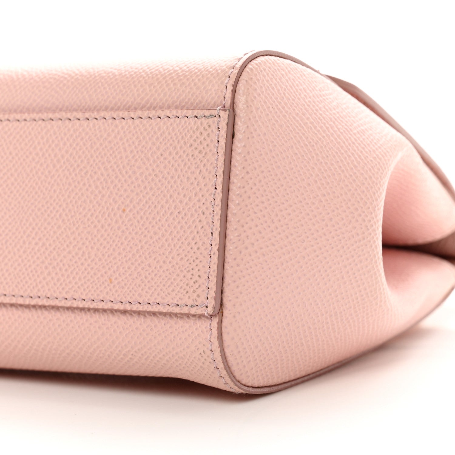 This is an authentic DOLCE & GABBANA Dauphine Small Miss Sicily Satchel in Rose Carne. This chic satchel is crafted of luxurious light pink textured calfskin leather. The bag features a reinforced leather top handle with brass links and leather anchors, and a classic facing flap. The flap opens to a leopard print fabric interior with a leather patch pocket.