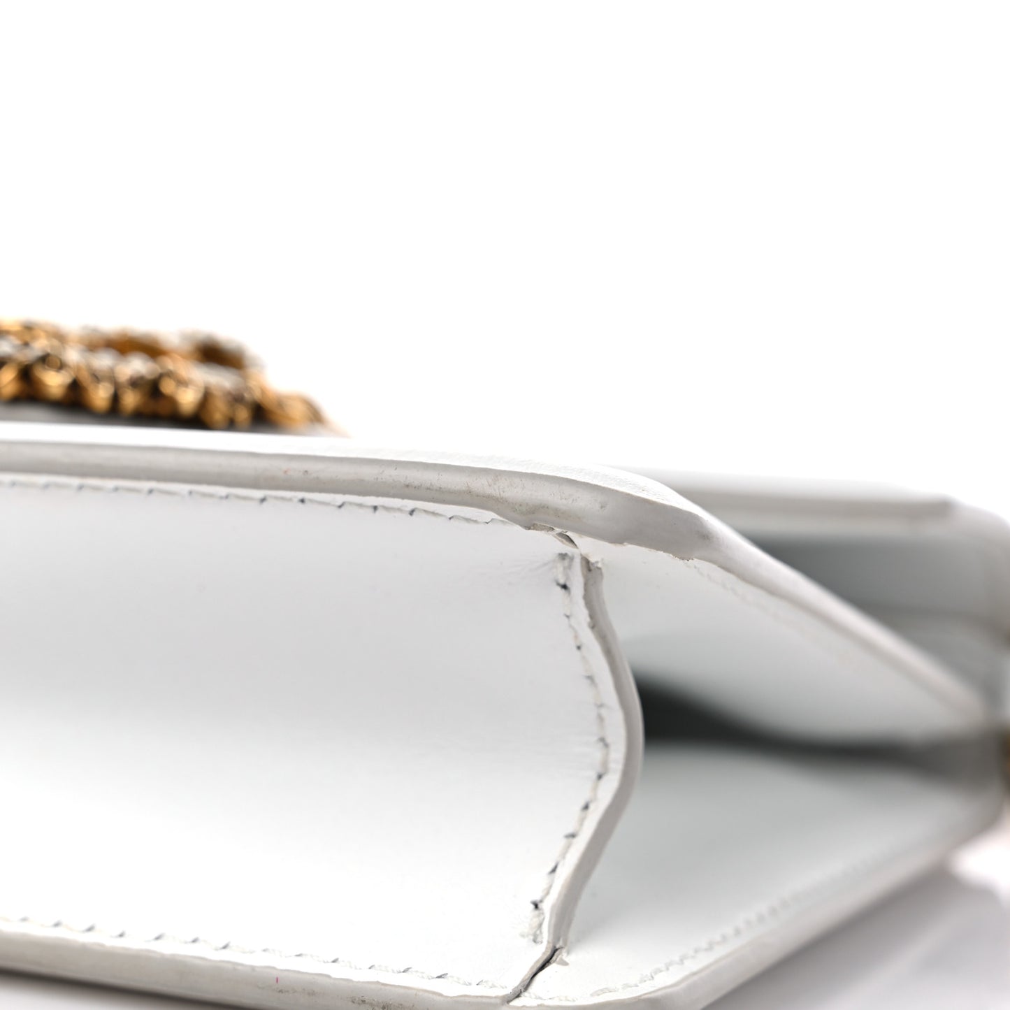 This is an authentic DOLCE & GABBANA Smooth Calfskin Small Devotion Envelope Top Handle Bag in White. This stunning petite bag is crafted of white leather. The bag features a removable gold chain-link shoulder strap with and a facing magnetic snap closure that is embellished with a golden heart of faux pearls and metal. The flap opens to a matching leather interior with a patch pocket.Follow this item for alerts. Dolce & Gabbana is a registered trademark of Dolce & Gabbana. FASHIONPHILE is not affiliated with Dolce & Gabbana.