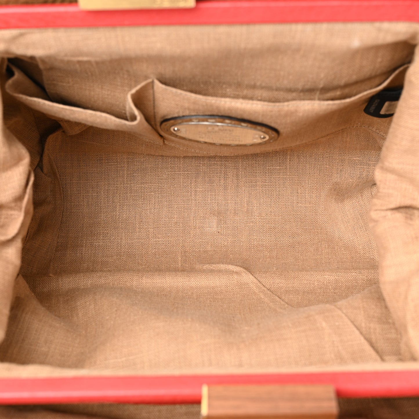 This is an authentic FENDI Calfskin Romano Selleria Firenze Frame Bag in Saddler Red. This stylish handmade tote is crafted of brown and red calfskin leather. The handbag features leather top handles, an open top, and bold stitching on the exterior. The top opens to a partitioned beige fabric interior with a kiss lock compartments and zipper pockets hidden under the side flaps.