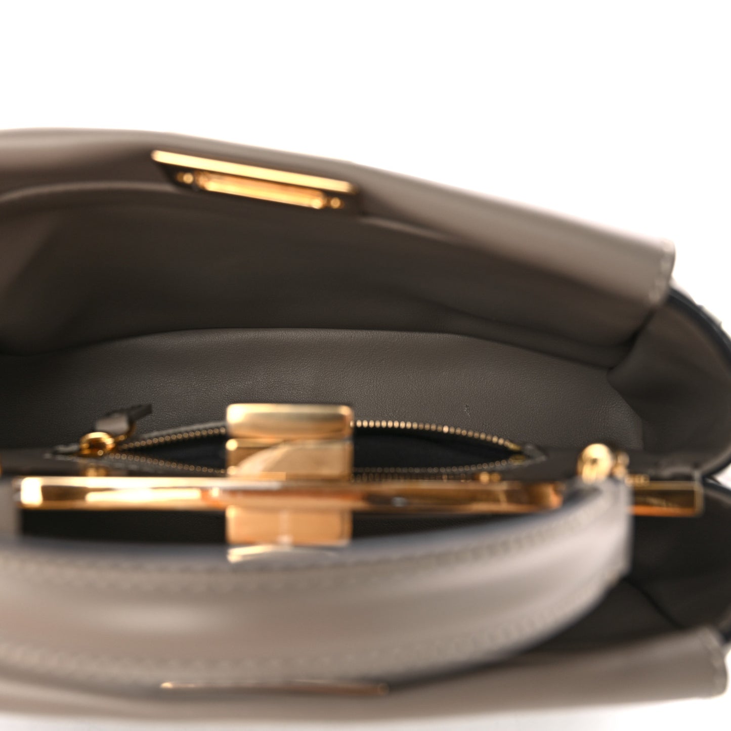 This is an authentic FENDI Calfskin Woven Mini Peekaboo Iconic Satchel in Tortora. This handbag is crafted of braided leather in grey and beige. This bag features a top handle, a shoulder strap and gold hardware including Fendi logo turn locks. The bag features a sturdy, reinforced leather top handle with gold links and turn lock that opens to a lambskin lining with pockets.