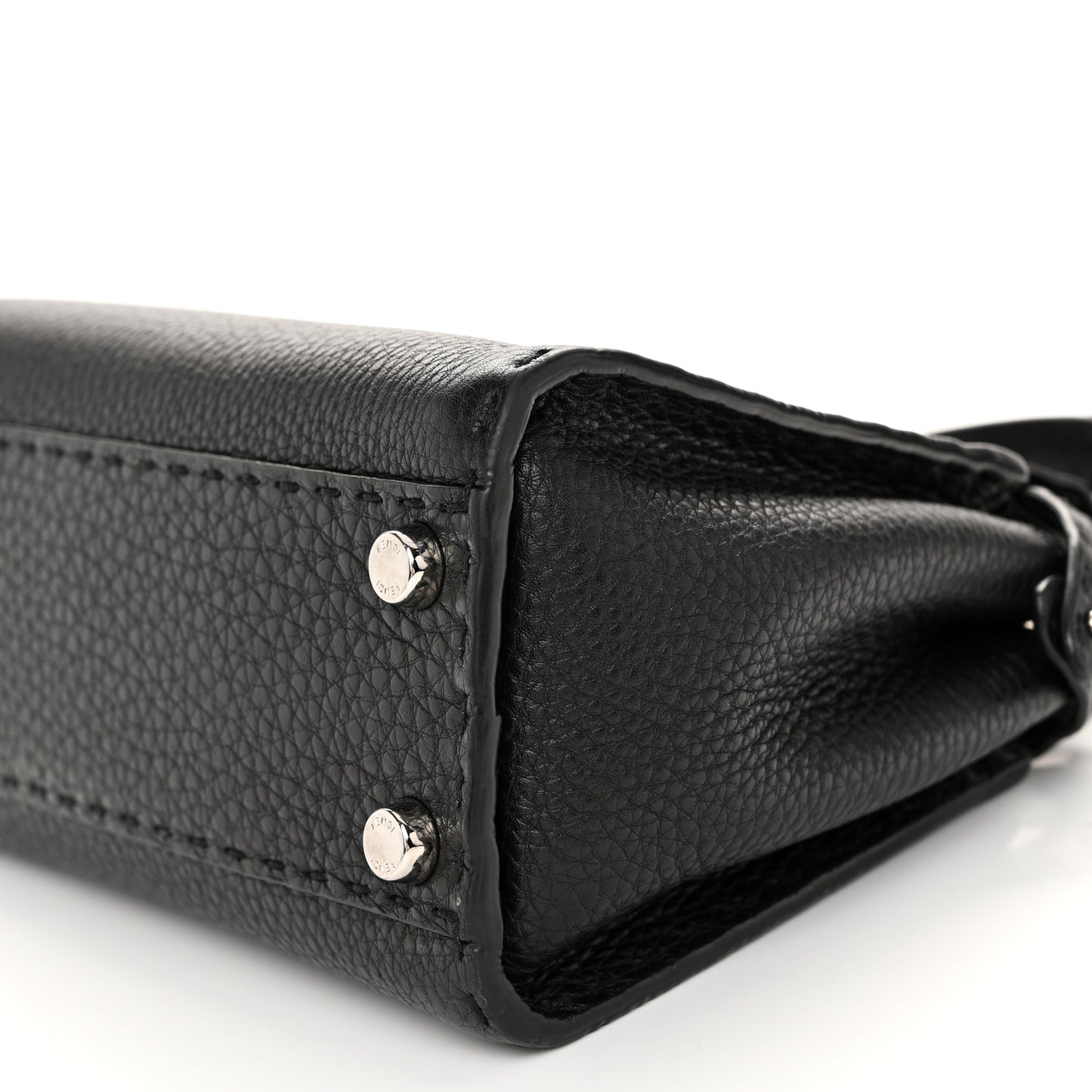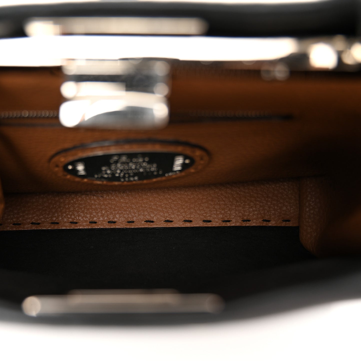 This is an authentic FENDI Cuoio Romano Selleria Bi-Color Mini Peekaboo Iconic Satchel in Black Mou. This satchel is crafted of calfskin leather in black. It features a sturdy top handle, an optional shoulder strap, silver hardware including handle links and a top interior structured frame. The bag also features a silver turn lock on each side opening to a tan leather and black microfiber interior with zipper and patch pockets.Follow this item for alerts. Fendi is a registered trademark of Fendi. FASHIONPHILE is not affiliated with Fendi.