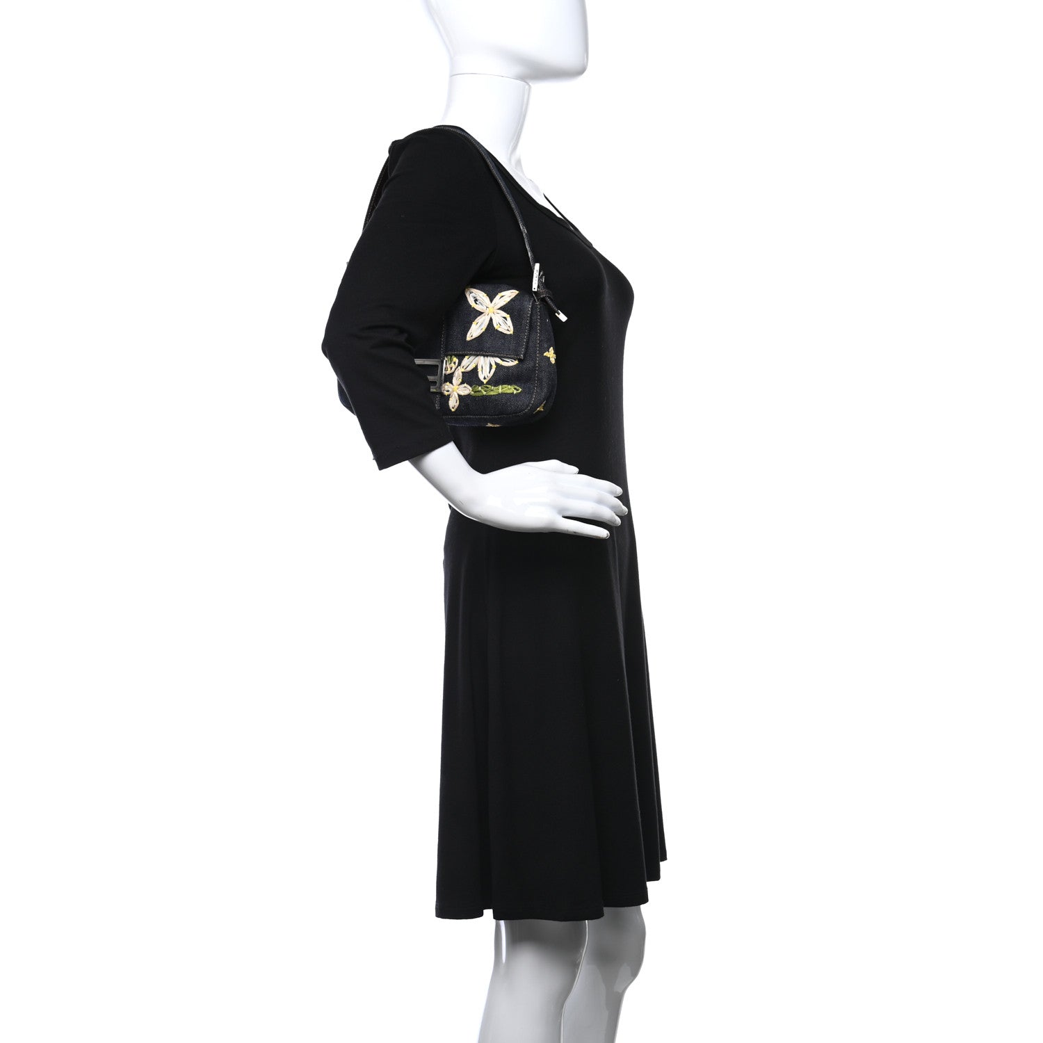 This is an authentic FENDI Denim Embroidered Baguette in Blue and Multicolor. This stylish baguette is crafted of denim canvas embroidered with a floral pattern. The bag features matching denim shoulder strap and leather trim with silver hardware and a frontal flap and a FF frontal silver logo. This opens with a magnet to a satin fabric interior with a zipper pocket.Follow this item for alerts. Fendi is a registered trademark of Fendi. FASHIONPHILE is not affiliated with Fendi.