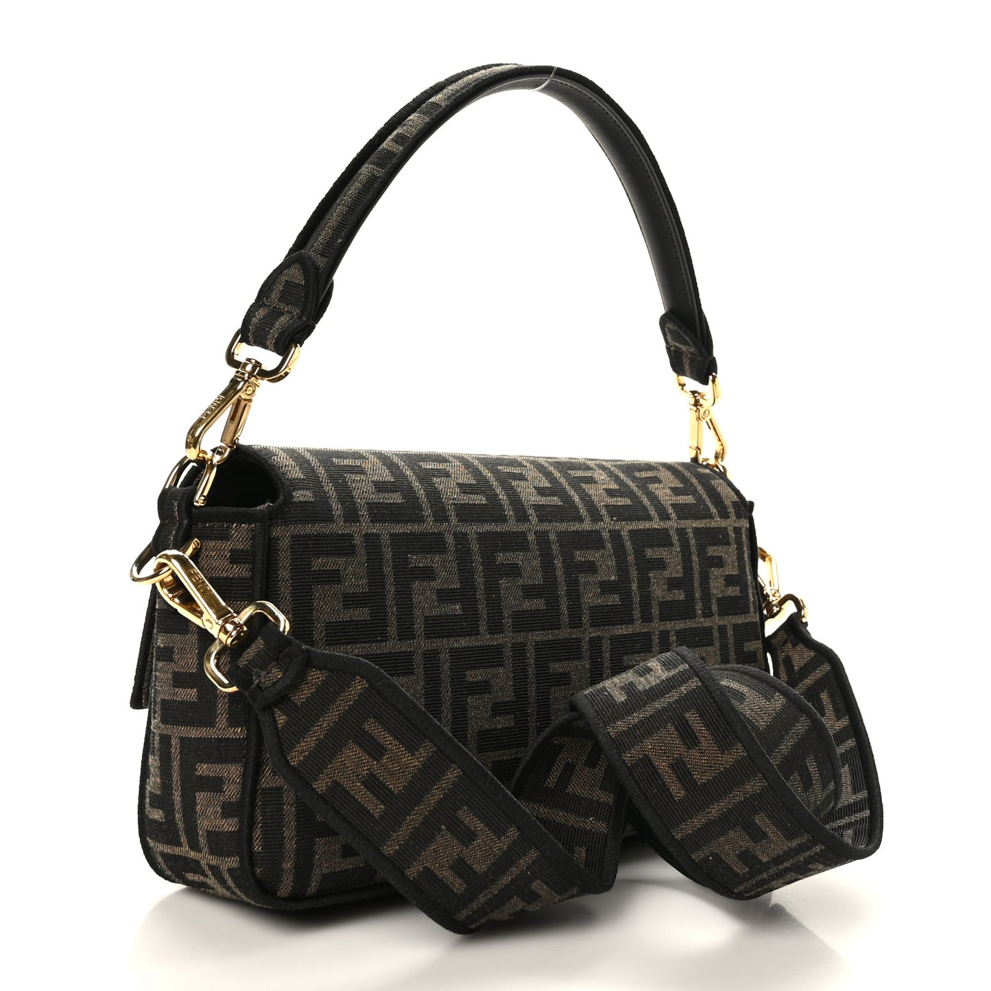 This is an authentic FENDI Fabric Jacquard FF 1974 Medium Baguette in Tobacco, Moro and Black. This stylish shoulder bag is finely crafted of Fendi Zucca canvas in tobacco brown. The bag features a matching top handle and an optional shoulder strap with gold hardware. The crossover flap opens with a gold Fendi FF logo clasp to a Fendi FF jacquard interior with a zipper pocket.Follow this item for alerts. Fendi is a registered trademark of Fendi. FASHIONPHILE is not affiliated with Fendi.