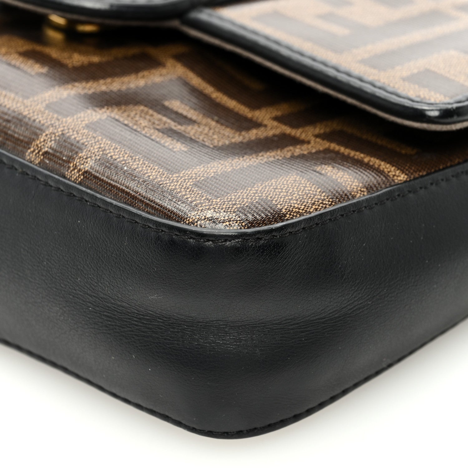 This is an authentic FENDI Glazed Fabric Vitello Century FF 1974 Stamp Patch Mini Double F Crossbody Bag in Mogano Panna and Black. This stylish bag is crafted of Fendi signature FF Zucca canvas in tobacco brown with black leather trim. The bag features a long aged gold chain shoulder strap and a front-facing flap that opens to a taupe microfiber interior with a patch pocket.Follow this item for alerts. Fendi is a registered trademark of Fendi. FASHIONPHILE is not affiliated with Fendi.